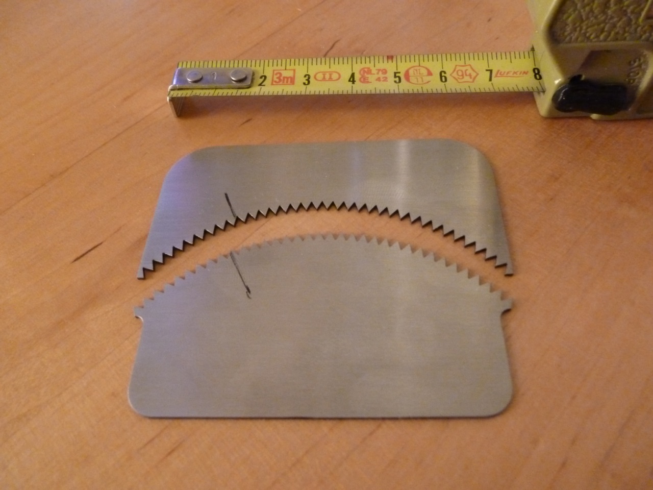 Ich glaube, Du hast Recht, es müsste klappen. Hatte nur überlegt: Wenn es nicht möglich ist, die beiden Kratzer einfach ineinander zu schieben, wenn sie auf einer Fläche liegen, dann würde es auch Probleme geben, damit bearbeitete Flächen aufeinanderzulegen - so dass Zahn in Nut geht... Aber beim genaueren Hinsehen sind es die außen liegenden Zähne, die ein einfaches Ineinanderschieben der beiden Kratzer erschweren/unmöglich machen, weil sie in einem zu großen Winkel zu der Bewegungsachse stehen und an ihre Gegenstücke beim anderen Kratzer stoßen (hoffe, es ist verständlich, was ich meine). Holz und Horn werden aber jeweils nicht so breit sein, wie der Kratzer. Und auf dieser schmaleren Breite gehen die Zähne schön ineinander zu schieben.