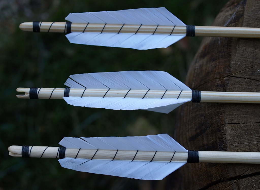 Ich stelle heute zwei Pfeilsätze vor, beide aus 11/32 Kiefernschäften (40-45# Spine) mit Feldspitzen und Gänsefedern aus der vollen Feder selbst geschnitten (freihand).