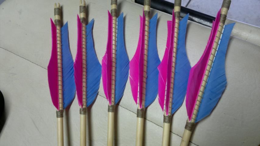 Der zweite Satz ist für einen Vereinskollegen, der eine dunkle Wicklung haben wollte. Da die Federn aus dem hinteren Teil der Originalfeder sind und dadurch hinten sehr schmal werden, mußte ich eine andere Federform wählen. Die Schäfte sind auf 30" abgelängt und das Spitzengewicht sind 125 grn.