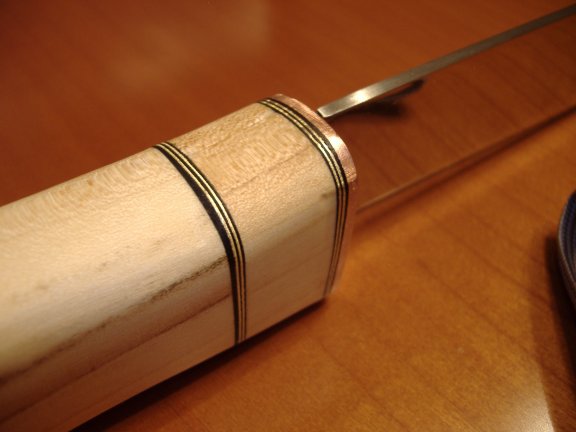 Kupfer, Leder, Messing, Leder, Messing, usw... Holz: Buche mit Pilz (wahrscheinlich... Hab grad kein Holzei zum Vergleich *g*) Finish: Leinölfirnis. Leider kommt auf den Bildern der Glanz nicht so richtig zur Ansicht.