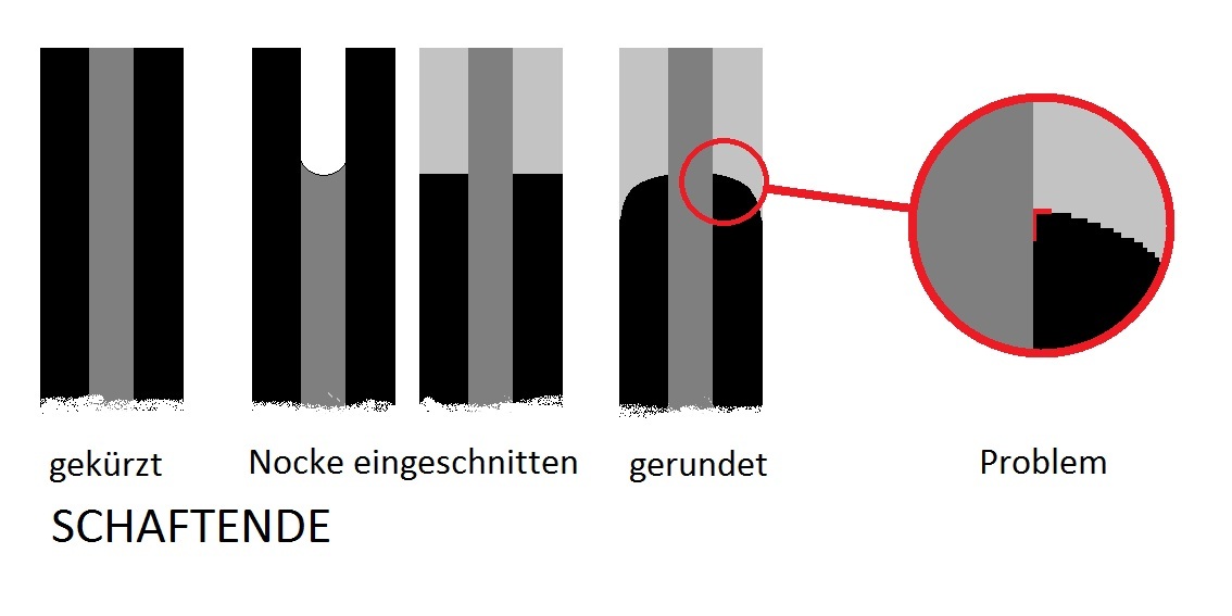 eine solche scharfe Kante an der Lochkante des Schaftes existiert meiner Meinung nach nur dann, wenn ich den Schaft innen ausbrenne oder ausbohre, sonst ist dort soviel Mark vorhanden, dass dort keine scharfe Kante ist.