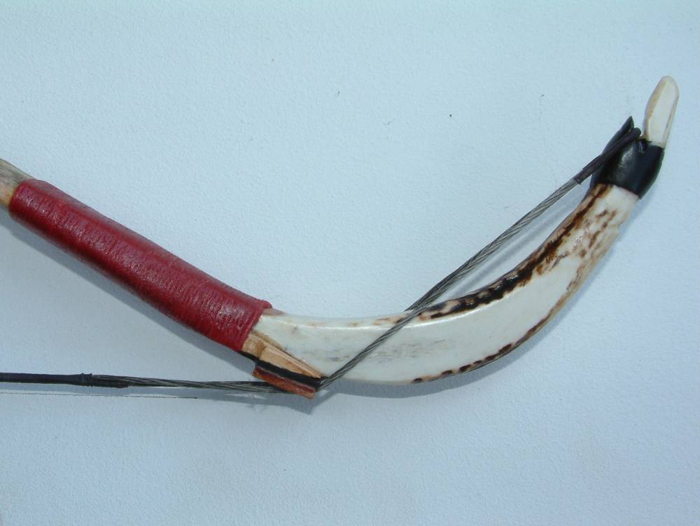 Die Sehnenkerbe ist mit einer Wicklung in Hautleim aufgebaut; das Sehnenbänkchen liegt auf dem Wurfarmholz mit einer Unterlage aus schwarzem Horn.