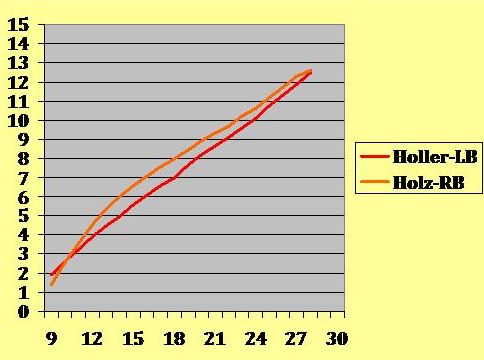 Der 28 lb-Holz-RB kommt man gerade auf 144 ft/sec, läßt sich aber weiter ausziehen und hat bei 30" dann 151 ft/sec.