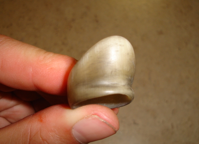 Hier ist ein Foto des Rings, den Stephan für mich für das Daumentechniktreffen vorbereitet hat. Der Ring ist aus einem Stück Rohr gearbeitet, weshalb er auf der Außenseite des Daumens etwas absteht. Für das Foto ist der Daumen nicht ganz geschlossen, der Verlauf der Kerbe täuscht also.