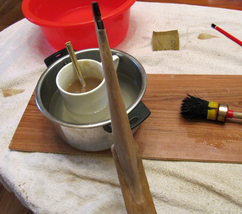 Ja, so kann ich mit Teilstücken eine saubere Oberfläche herstellen, die "Originalen" bestehen meist aus vielen Teilstücken Birkenrinde oder Rohhaut. Eine Schlangenhaut auf Rohhaut wär doppelgemoppelt, es geht ja darum eine wasserdichte (optimalerweise) Oberfläche zu erhalten, die den Sehnenbelag komplett einschließt und schützt. Ich nehme gerne Rohhaut, da diese sehr gut Farben/Lacke auf Wasserbasis aufnimmt.
