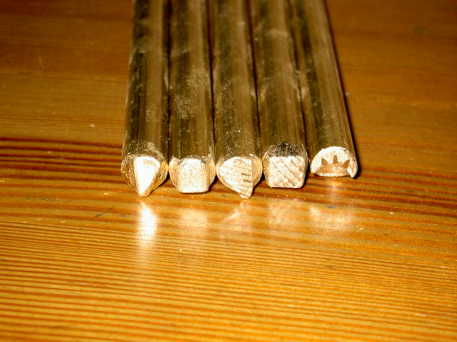 Ich habe da mal ein Foto von einigen meiner Lederverschönerungseisen gemacht. Wie zu sehen, sind die nicht gekauft, sondern lustig selbst gedremelt.