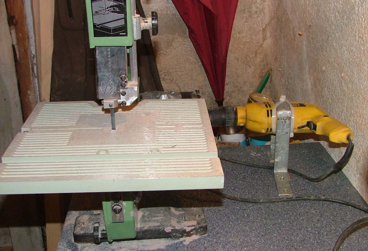 Er hat schnell festgestellt das der Motor der Bandsäge rettungslos verloren ist, aber der Motor hat eine durchgehende Welle die den Lüfter angetrieben hat, also den Lüfter abmontiert, Bohmaschiene mit Schnellspannfutter an die Welle geflanscht. Eine Halterung für die Bohrmaschiene aus einem Blumenkistenhalter gebaut (das mir ja keiner auf die Idee kommt meine Frau auf diesen kleinen Üebrgriff aufmerksam zu machen. Hm... das könnte noch Probleme verursachen aber andererseits, bis zum Frühjahr ists noch lang).