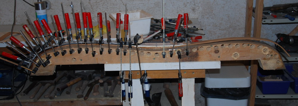 Verleimen der Hornstreifen, dadurch das die Hornstreifen gut 2 Stunden in der Sauna gelegen haben sind sie gut anformbar. Zuerst die eine Seite