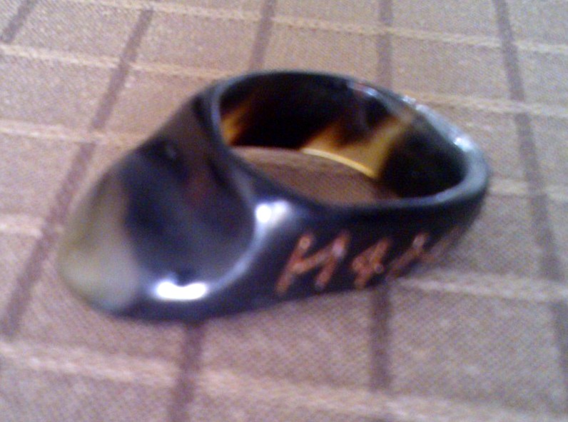 Einen hornen Ring, zusammen mit Eric von einen belgischen Traditioneller shop hergestellt.. ich habe ihn selbt zur meinen Daumen 'passend' gemacht (weis nicht wie mann das auf Deutsch sagt). und er hat dann ein alt ungarischer 'padar' drauf gemacht..