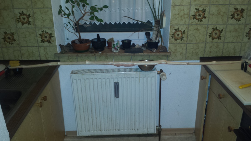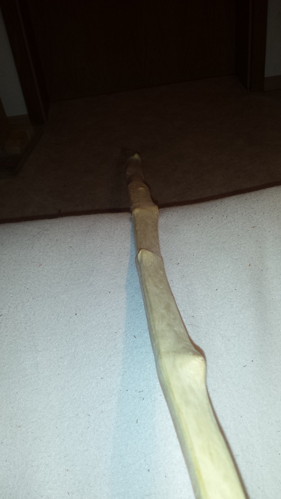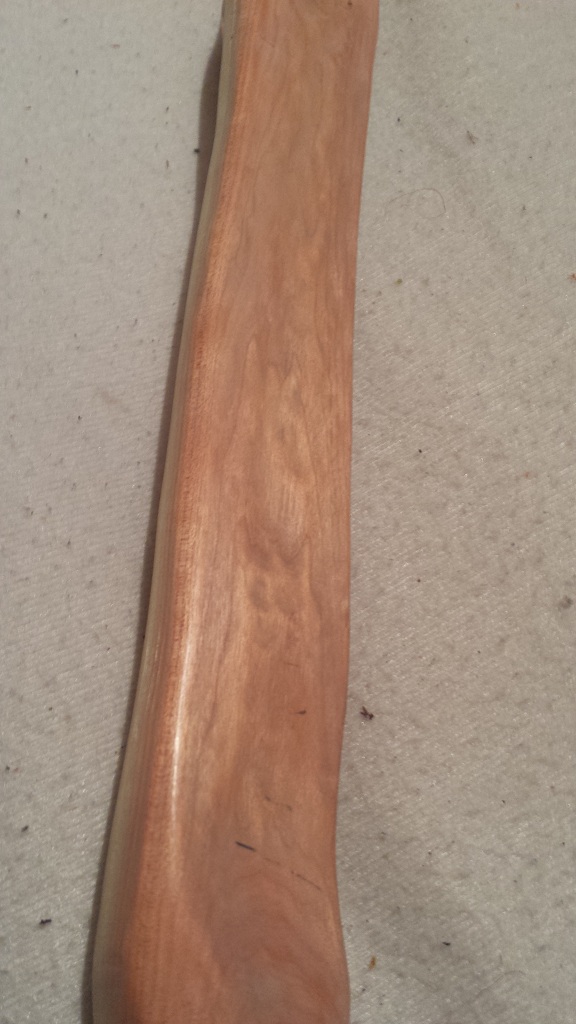 So es ging weiter. Der Bogen hat jetzt mal den ersten Schliff bekommen und die Overlays aus Wacholder sind aufgeklebt und werden morgen in Form gebracht.