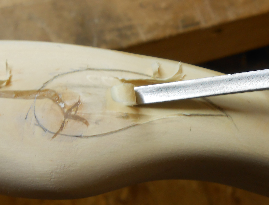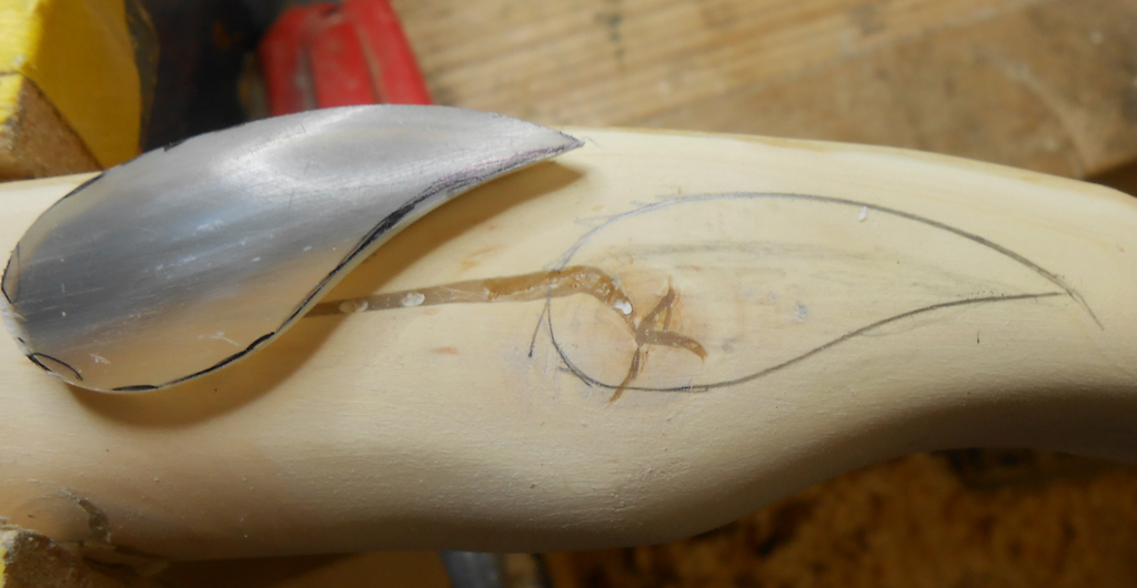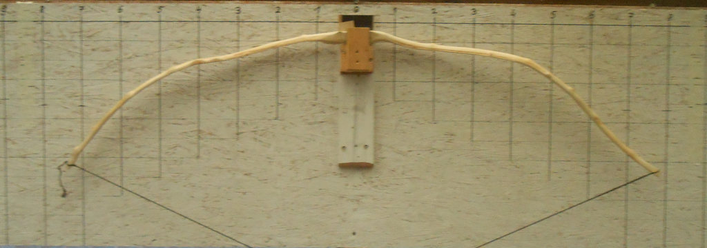 Die Pfeilanlage habe ich aus Horn ausgeschnitten und nach unten hin leicht angeschrägt. Danach wird die Form mit einem spitzen Bleistift auf den Griff übertragen. Dabei ist darauf zu achten, dass der untere, also der abgeschrägte Rand des Inlays übertragen wird. Damit lässt sich das Inlay besser versenken, weil immer noch ein wenig Spielraumvorhanden ist, falls man sich ein klein wenig verschneidet. Die angezeichnete Form wird dann mit einem scharfen Beitel oder Messer vorsichtig ausgehoben. Zwischendurch sollte man das Inlay immer wieder anpassen. Bei der ausgehobenen Form im Griffstück werden die Ränder ebenfalls angeschrägt. Mit ein klein wenig Geduld lässt sich das Inlay so nach und nach einpassen.Anschließend wird verklebt und verschiffen. Das Inlay ist nun vollständig eingepasst und plan verschiffen. Und so sieht er bis jetzt aus:Bei der unteren Nocke musste ich das Overlay bis ans Astloch ranziehen, weil mir bei der Bearbeitung des Astloches ein Rückenspan weggerissen ist. Hat zwar bei der Bearbeitung und beim Tillern keine Probleme verursacht, aber sicher ist sicher.Heute werde ich wohl, als letzte Arbeiten, den Bogen mit Schellack und dann mit Leinöl versiegeln und noch eine Sehne klöppeln.