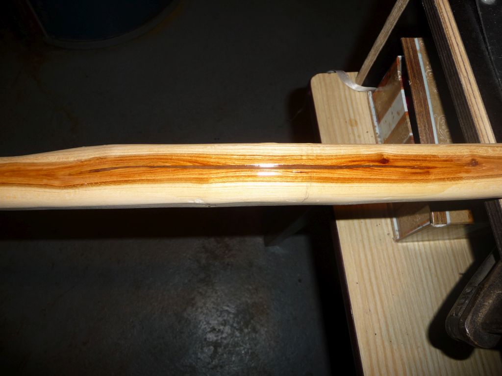 Nachdem meine Schlehe nur 5g in 24h im Wohnzimmer verloren hat(wiegt jetzt 801g ergibt 0,6% Wasserverlust), habe ich mich entschlossen den Riss im Griff zu füllen. Also Epoxidharz angerührt und mit dem Heißluftföhn richtig in das Holz hineingearbeitet. Jetzt kanns es noch einige Tagen trocknen. Ich denke ich kann spätestens mitte nächster Woche anfangen zu tillern.