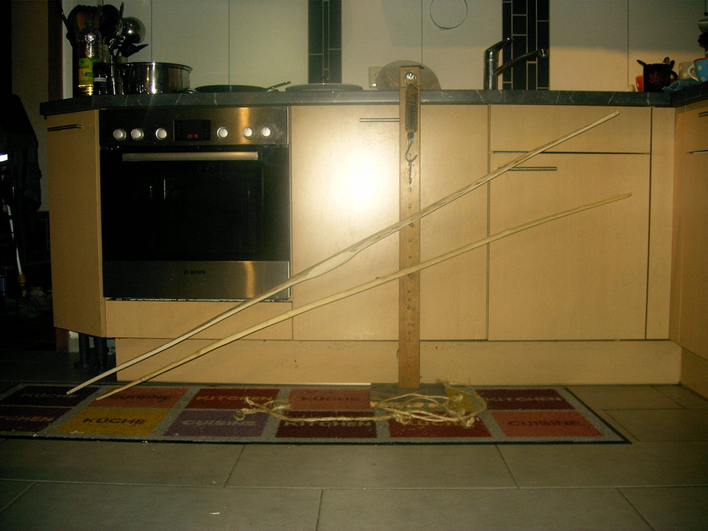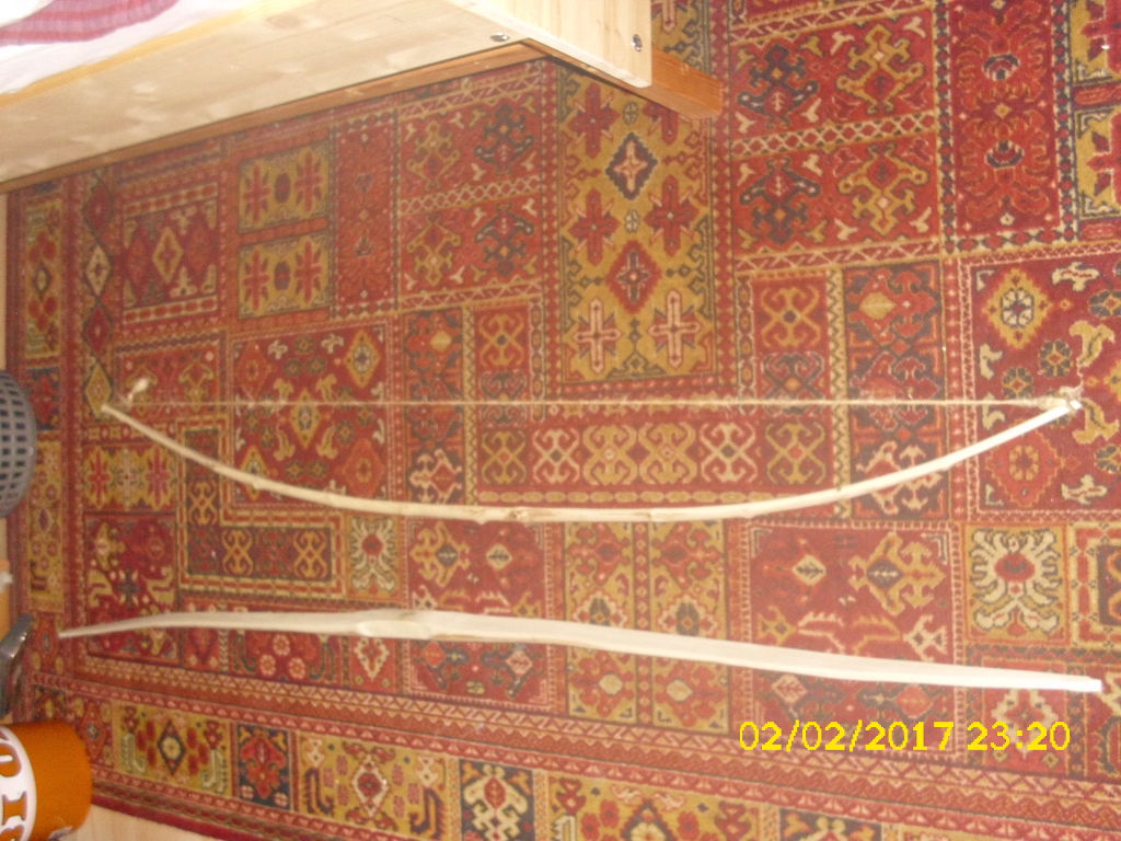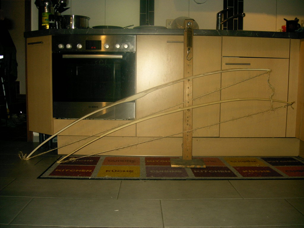 Die Sehnenlage.... schön, das er trotz der seitlichen Dämpfung so "gerade" geblieben ist Und ein paar Gemeinheiten... Insgesamt betrachtet ganz o.k; ein paar Pfeile jeglicher Gewichtsklassen fliegen lassen.. von 20-40g, macht er alles, egal wierum gehalten und zieht sich echt angenehm. Derzeit wiegt er noch 430g und hat seine 21kg auf auf 78cm, grob umgerechnet ca 46#/31". Mit etwas Feinarbeit und Finish sowie Einschiessen wird das noch ein bißchen kosten, aber der Traum von über 40# für diese dünne,windige, nixige, 2.Wahl-Ding scheint so langsam machbar...
