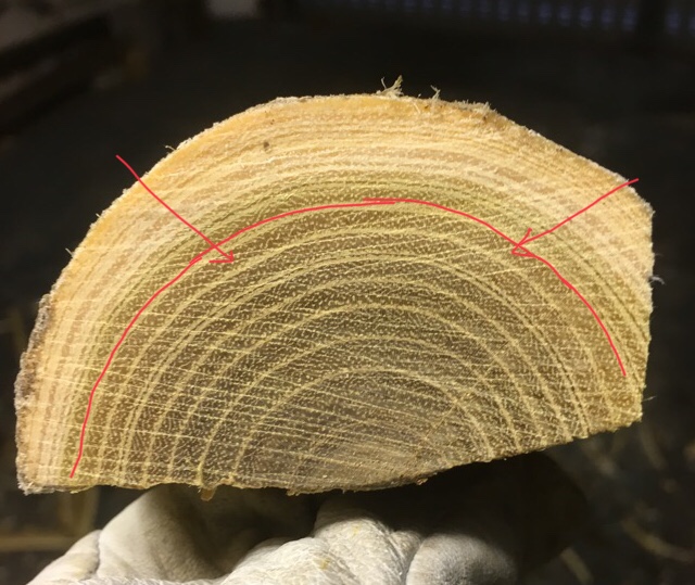 Der unter der roten Linie ist es geworden. So hab ich gerade noch genug Fleisch für den Griff. Und noch etwas zwecks schnellerer Trocknung grob in Form gebracht.