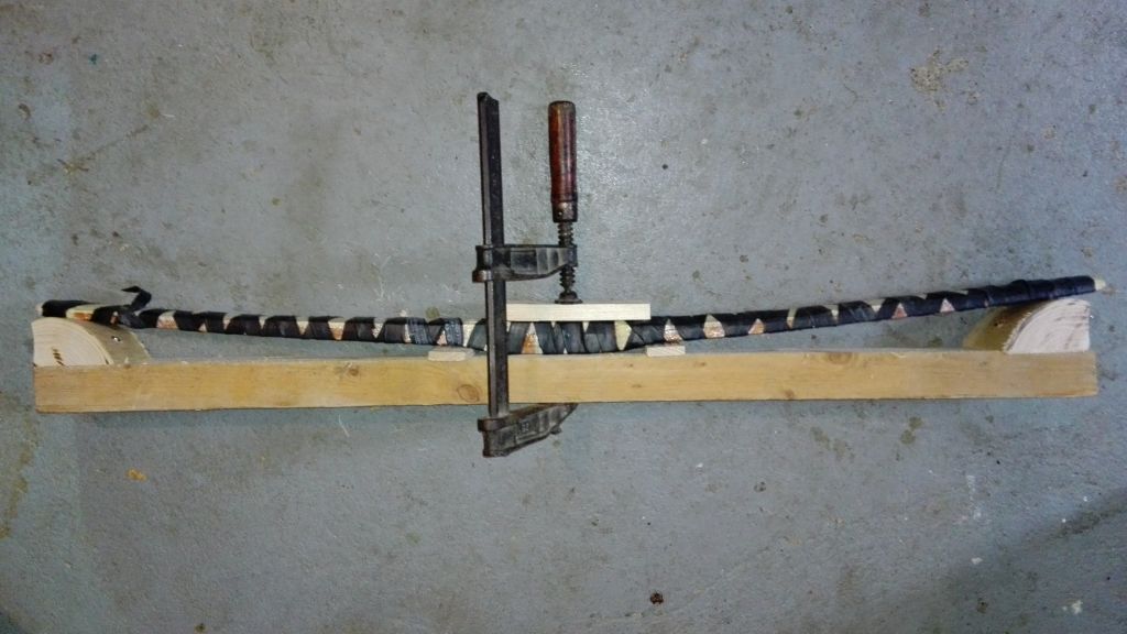 In der Zwischenzeit habe ich den Eibenkern getapert und mit Epoxidharz aufgeleimt. Das Ganze wurde mit etwas Reflex auf ein Balken gezwungen und durfte an der Heizung trockenen. Heute habe ich den Bogen seine Form gegeben , die Nadeln eingepasst und mit ca.7° eingeleimt. Vor dem Leimen wurde der Bogen bereits vorgetillert. Dabei habe ich gemerkt, dass die Kombi Hasel/Eibe gar nicht so schlecht ist. Ich bin echt gespannt wie der wirft :)