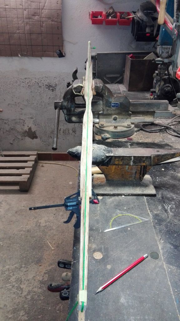 Also schnell die zwei Eibenbretter zusammen gespleißt und die Tage wird das Ganze plan geschliffen. Danach wird die Eibe mit einem Taper versetzt und der Hasel kommt drauf. Mal sehen was so ein Holzkomposit leisten kann ;)