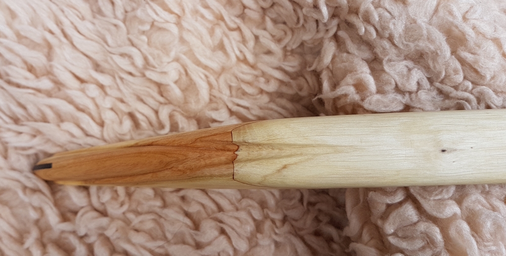 Allerdings nicht so viel, man muss bedenken, dass da ja die Sehnenkerben drin sind und die sind ca. 4-5 mm tief. Und die Sehnenführung funktioniert auf die Art sehr gut.