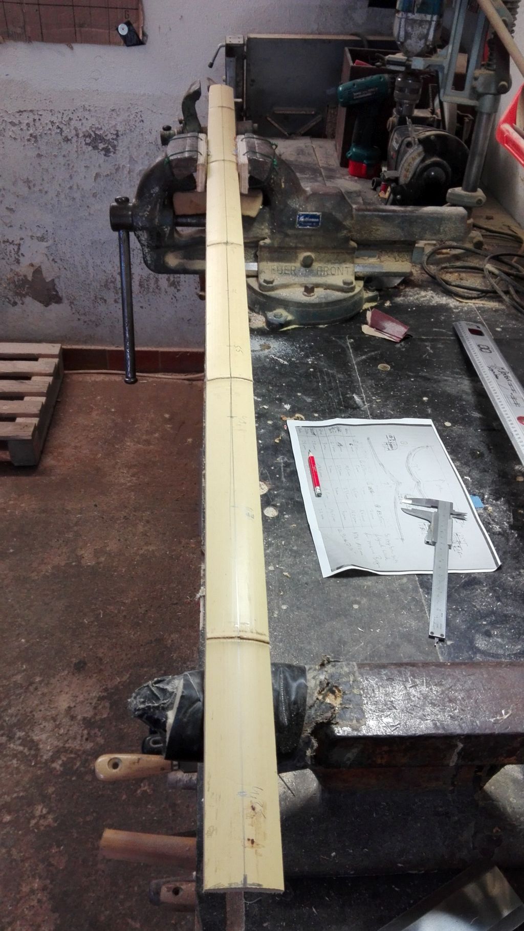 So da morgen mein Bambuslaminat für den Bauch kommt , habe ich heute schon mit dem Bambusbacking angefangen. Zuerst alles aufgezeichnet, auf Länge gebracht und mit der Abrichthobel auf Dicke gebracht. Danach die Leiste in die Form geföhnt. Sie hat den Reflex nicht ganz behalten, da die Nodien sich schlechter biegen lassen.