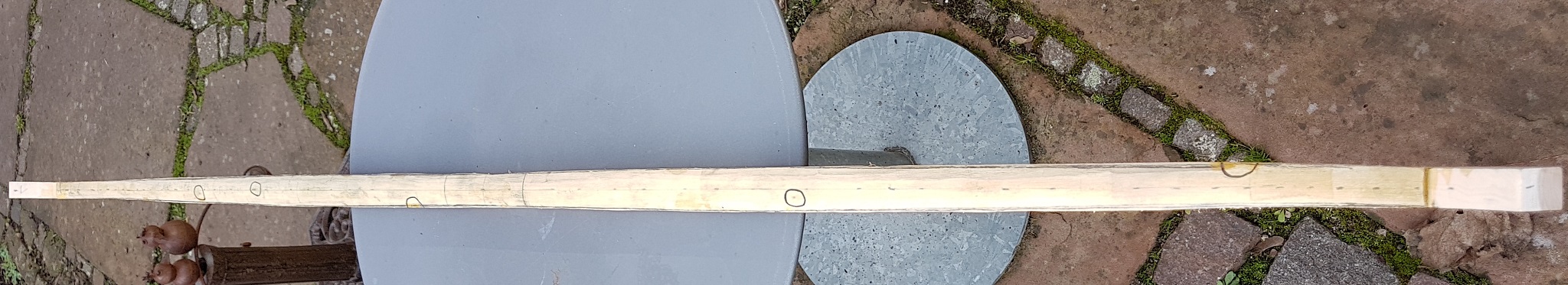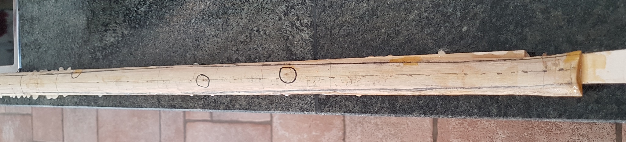 Dann habe ich zum ersten Mal den Rohling auf die Tillerwand gespannt und gezogen und dann für heute keine Lust mehr gehabt, bzw. will ich noch an den Pfeilen weiter machen.