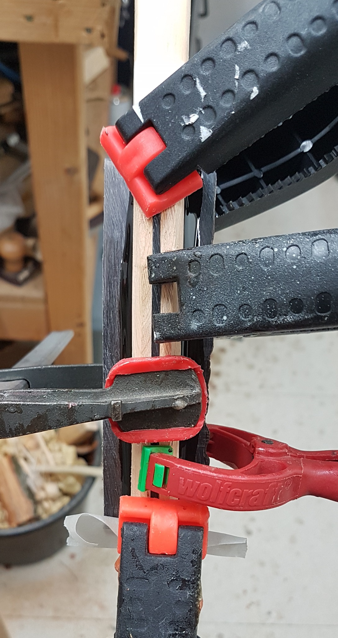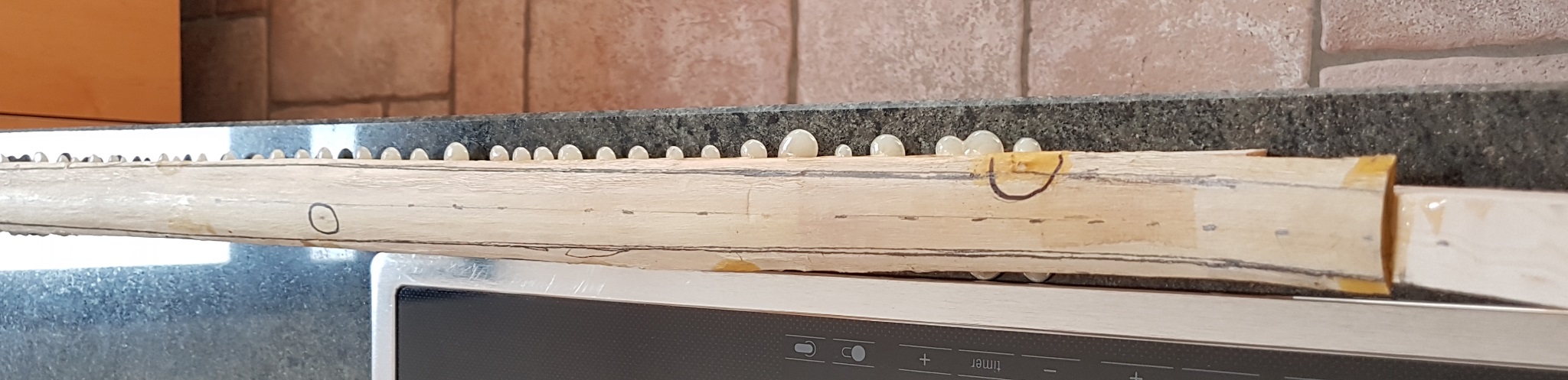 Dann die Bauchrundung an diversen Stellen mit einer Raspel korrigiert und mit Ziehklingen abgezogen und nach jeweiliger Ansicht auf der Tillerwand 3x nachgeschabt. Dann noch die Lage der Siyayhs gecheckt, da hatte ich entweder etwas schief geklebt oder der Bogen hatte sich etwas verzogen. Aber das ist kein Problem - die Dinger sind eh noch deutlich zu breit.