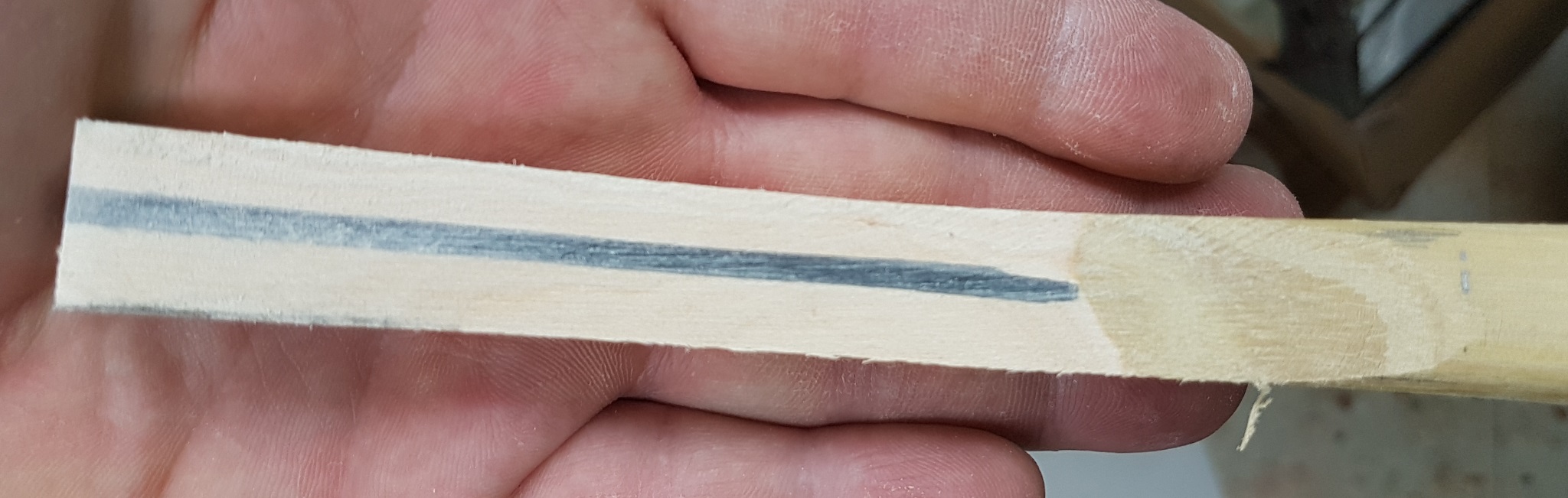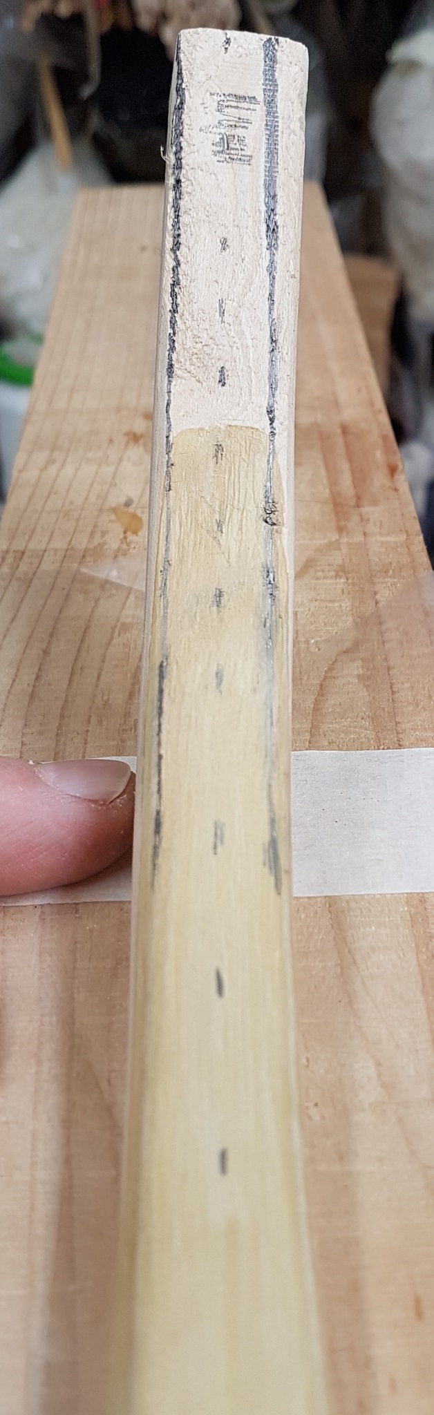 Dann gings noch weiter: Dickentaper angezeichnet und mit der Bandsäge relativ genau ausgesägt. Dann habe ich den Bauch gerundet, alle 10 cm die Dicke RE und LI gecheckt, nochmal kurz nachgeraspelt und für zunächst passend empfunden. Ein WA ist durchgängig ca. 0,5 mm dicker - recht so.