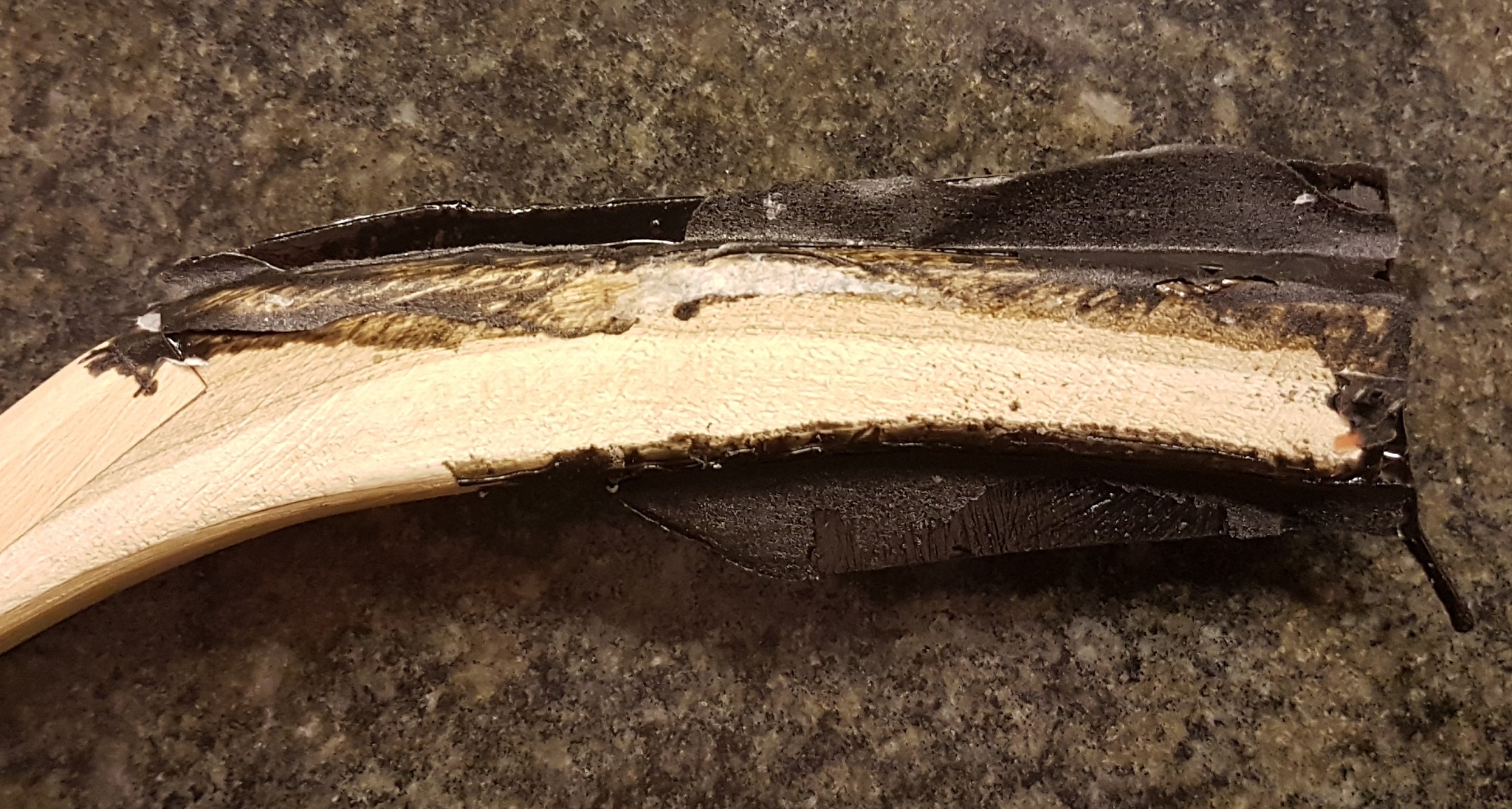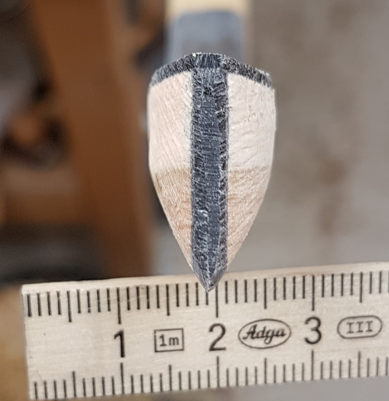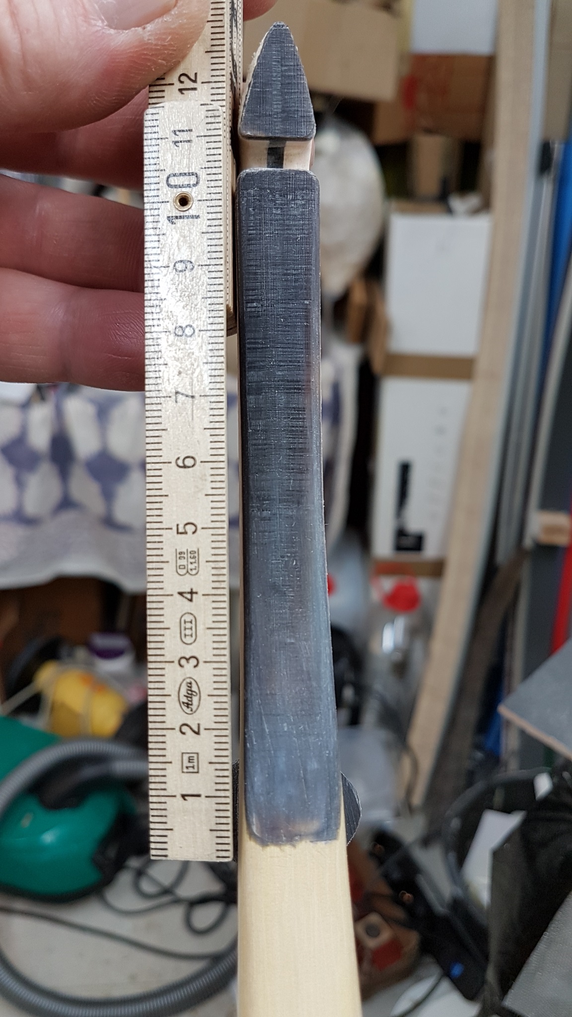 Und nochmal weiter: Ich bin ein klein wenig verunsichert, ob die Siyahs halten werden. An der Sehnenkerbe habe ich 14 mm Breite und 13 mm Dicke. Der Bogen soll irgendwo bei 85# landen.
