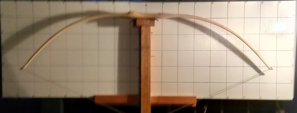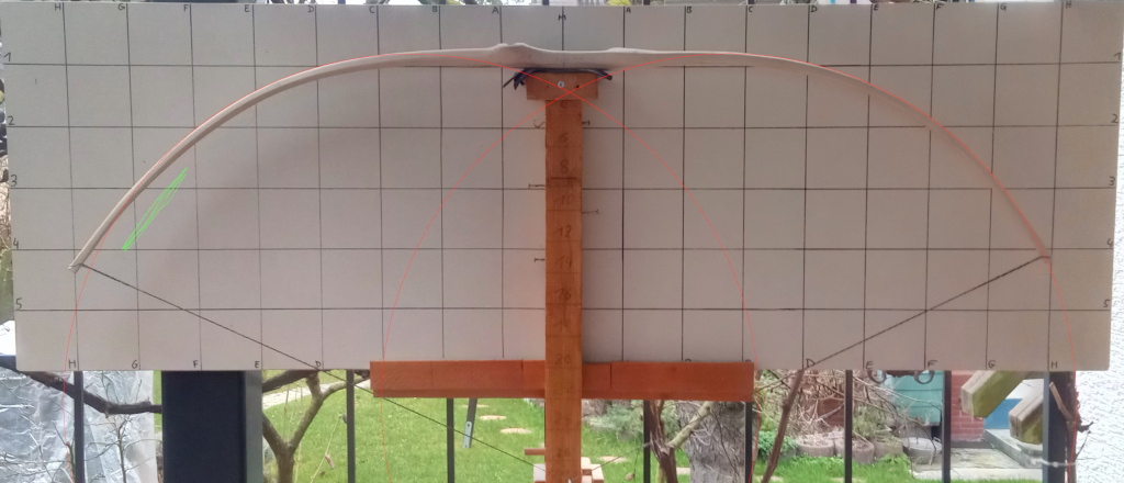 So, heute morgen noch etwas gemacht. Da es links in der Mitte des Wurfarms mehr biegt, mußte ich woanders was machen. Man siehts auch, wenn man ein Brettchen drüberschiebt (Tiller Gizmo für Arme sozusagen ;D ).