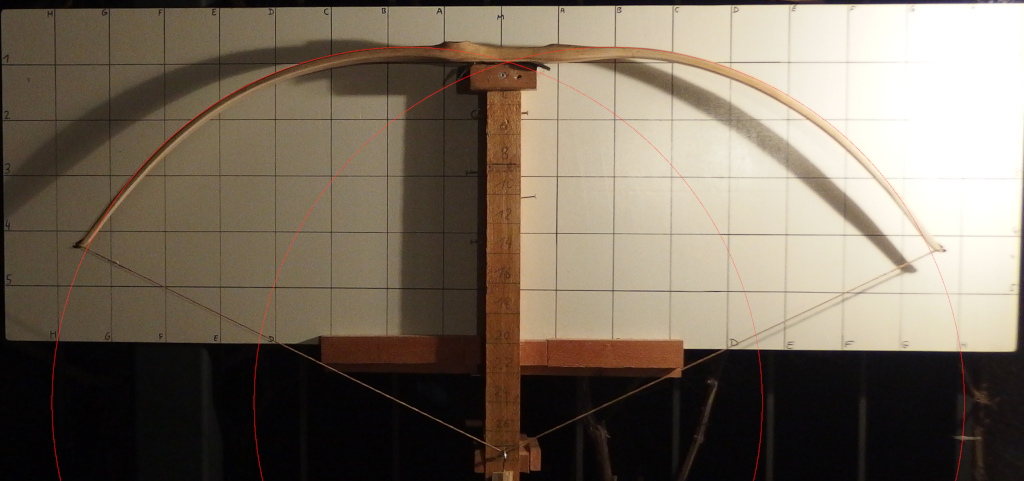 also du solltest das mit den Kreisen lassen, da du sonst im zweiten Drittel eine zu starke Biegung erzeugst und im letzten Drittel sind die Enden so noch zu steif. Ich habe dir mal eine Ellipse drüber gelegt, damit du den Unterschied siehst. Dadurch hast du viel Zuggewicht verloren. Ich würde Kreise oder Ellipse nur als Anhaltspunkt nehmen , besser du nimmst ein 7,5cm gerades Stück Holz und überprüfst damit wo der Bogen biegt und wo nicht. Damit schulst du dein Auge und brauchst bald keine Kreise mehr ;)