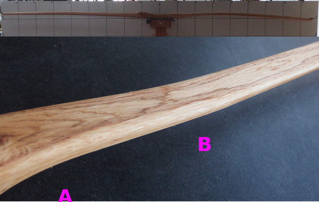 So, hier noch ein abgespanntes Bild, Bogen ruhte über Nacht, also ohne Stringfollow. Direkt nach dem Abspannen sieht es so aus, als sei vor allem zwischen A und B der Bogen überlastet. Von den Jahresringen her ist dort auch weniger Holz, die Dicke paßt aber. Deshalb habe ich die Stelle unten im Bild mal gezeigt. Unbelastet sieht man rechts den Set eher bei C-D und nicht bei A-B. Also ich werde den am Wochenende erstmal Probeschießen gehen, ich schätze er hat so ca. 37# aktuell. Schicht Leinöl und Douglasienöl ist schonmal testweise drauf. Am Tiller werde ich vor dem Probeschießen nichts mehr rumbasteln. Meinungen dazu sind aber willkommen ;D