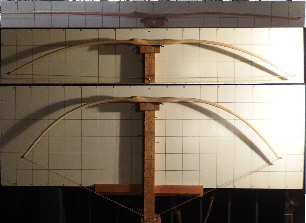 Hier abgespannt und Vollauszug im Vergleich. Legt man den rechten über den linken Wurfarm sieht man, dass er rechts bei F mehr biegt. Außerdem könnte er rechts vor C noch einen Hauch. Gerade so die ersten 15cm ab dem Griff biegen, aber könnten ggf. mehr biegen. Soweit meine Überlegungen, die noch nicht zum Entschluß gereift sind.