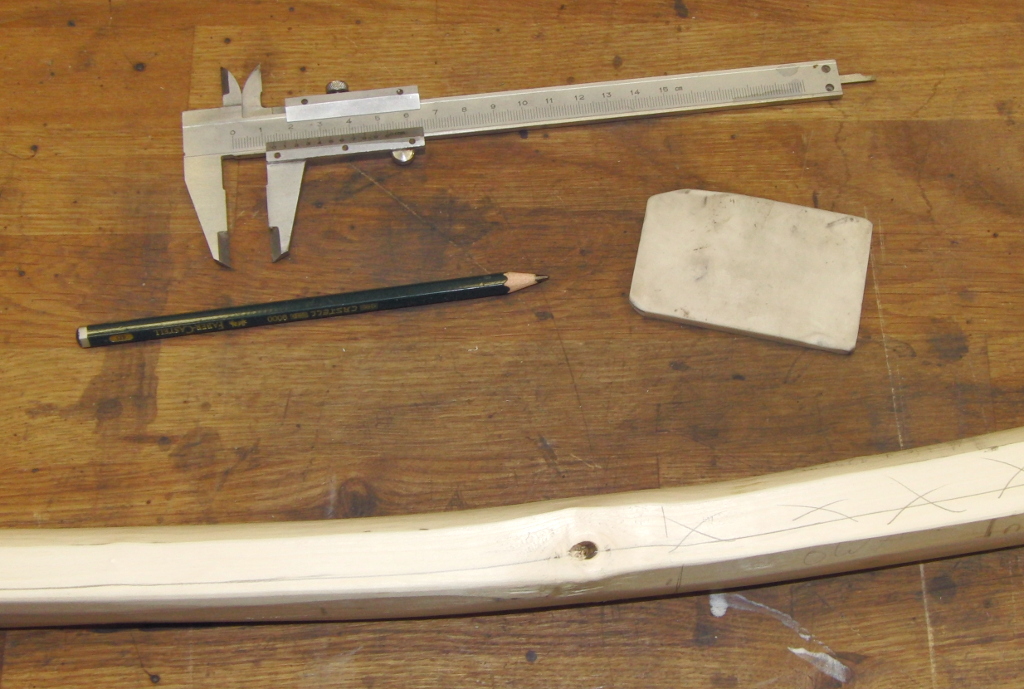 Die Werkzeuge vom vorherigen Beitrag haben sich nicht geändert, allenfalls ein wenig Geduld habe ich noch ins Portfolio mit aufgenommen. Den Rohling habe ich (hatte vergessen, das im letzten Beitrag zu erwähnen) So, 09.02.2020 von um 27,2 g und gestern, Mo, 10.02.2020 um 20,0 g auf 663,75 g reduziert und dabei mit immer noch überlanger Tillersehne (das Monstrum aus dem vorhergehenden Beitrag) mit 40# Kraftaufwand um 7,5" ausgezogen.
