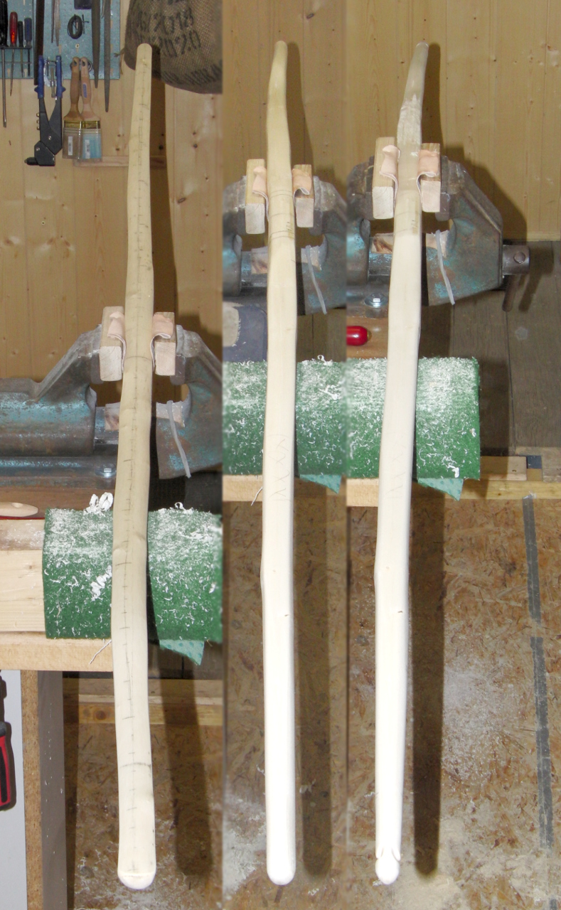 Nach dem ungefähren Angleichen der Wurfarme und einer halbwegs vernünftigen Verjüngung des Dicken- und Breitenverlaufs zu den Wurfarmenden hin habe ich die Wurfarme gleichmäßig geschwächt und im Bodentiller immer wieder geprüft.