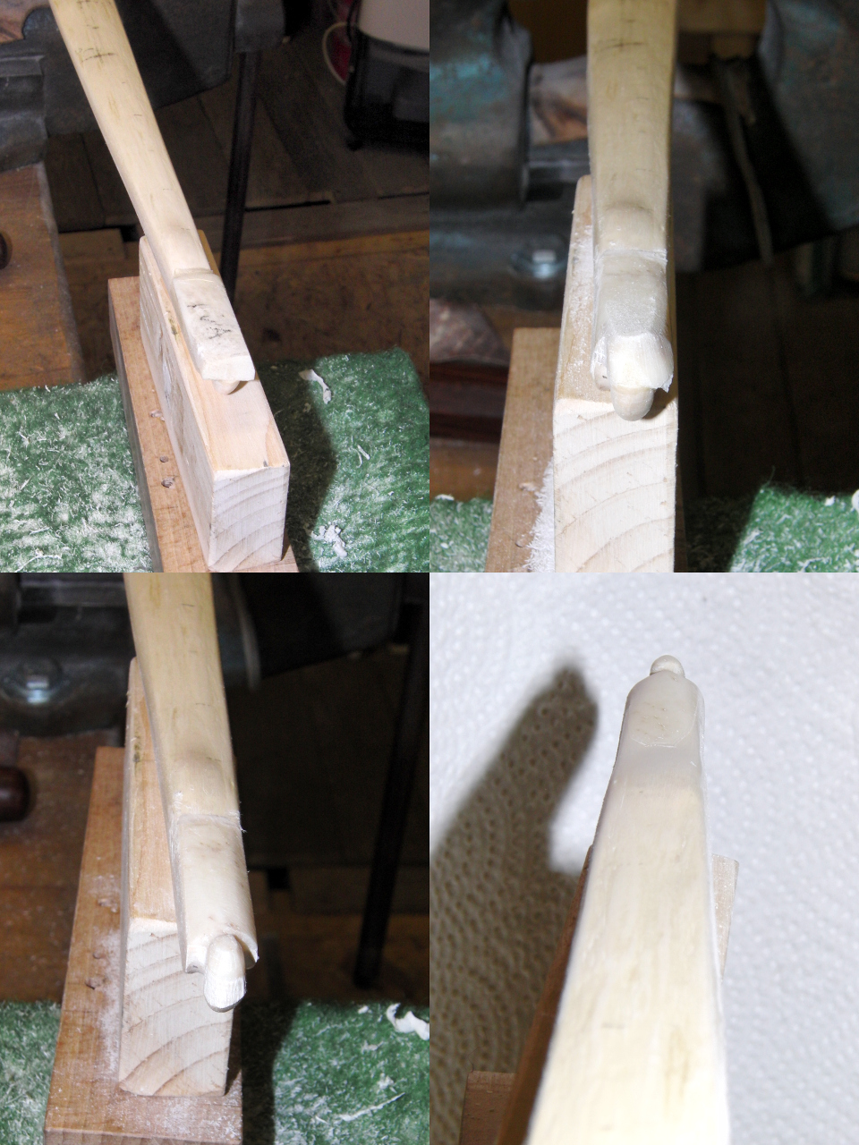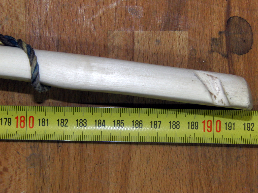 Endlich (nicht das Ende des Bauprozesses) habe ich mich durchgerungen, die provisorischen Nockkerben zu verfeinern, um die Wurfarmenden auf ihre endgültigen Maße zu bringen (wahrscheinlich würde der Fortgeschrittene Bogner hier noch Potential zur Leistungssteigerung sehen - oder auch nicht, bei dem Verhunzungsgrad).