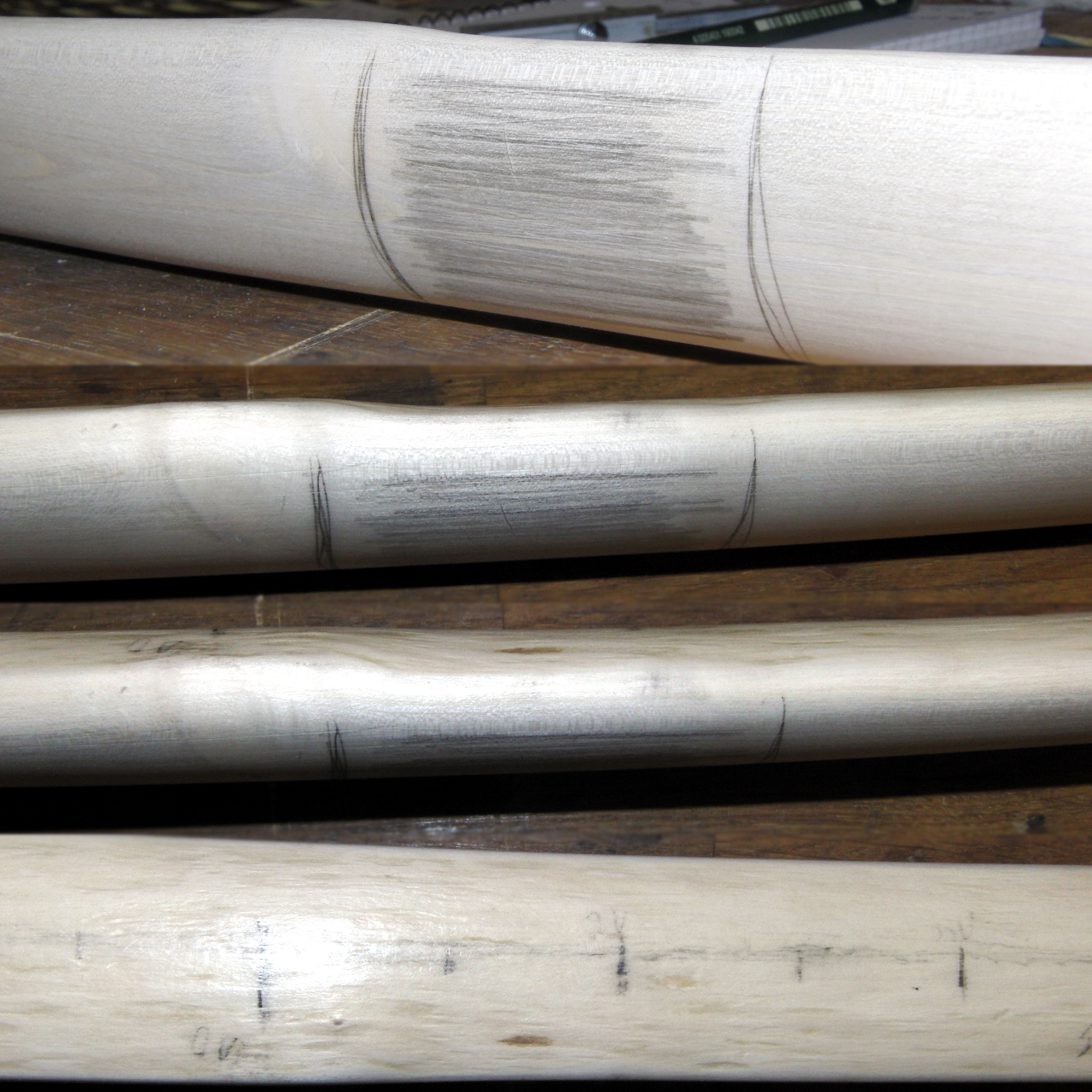 Zweitens habe ich scheinbar doch doof angetillert und nach dem Abspannen einige Stauchrisse am geplanten unteren Wurfarm bei ca. 11,5 " unterhalb der Griffmitte.