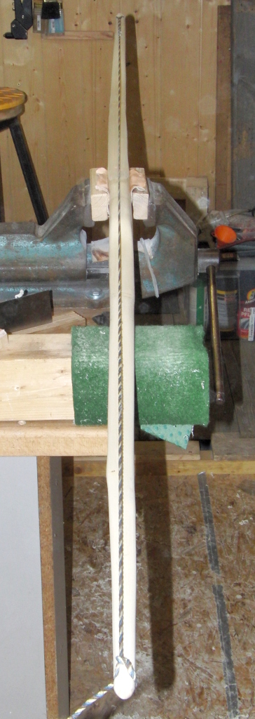 Freitag, den 07.02. und Samstag, den 08.02. fand die weitere Bearbeitung des Staves statt. Die Erstellung einer längeren Tillersehne (18 Strang Dacron) war erforderlich, da die vorhandene (