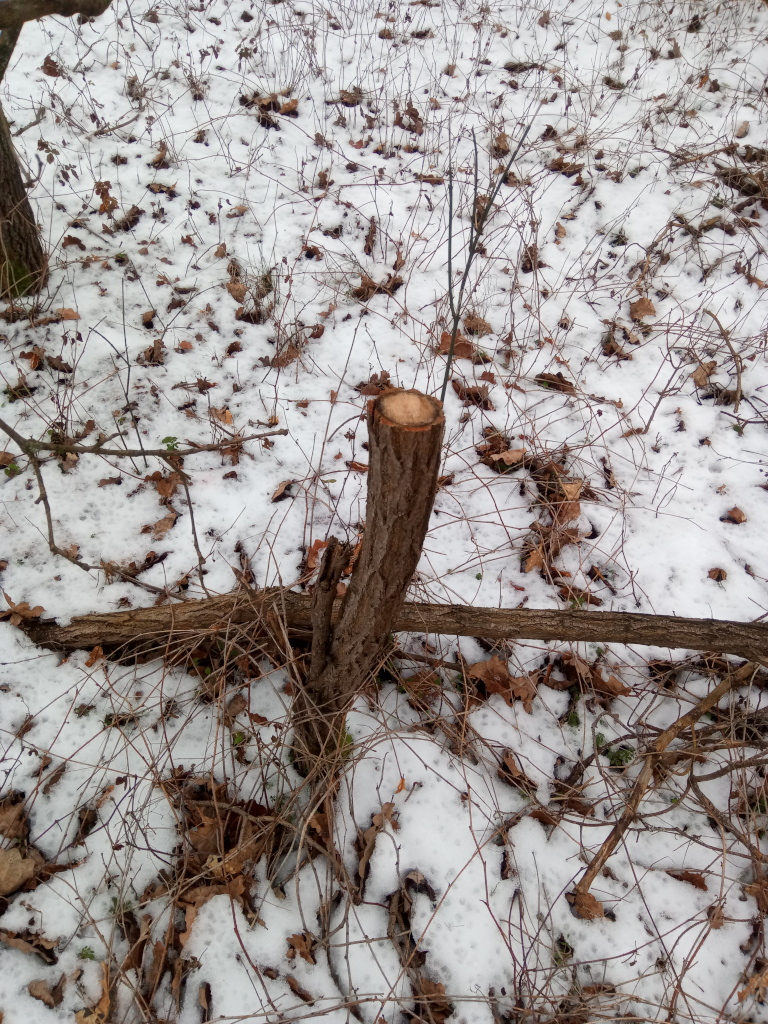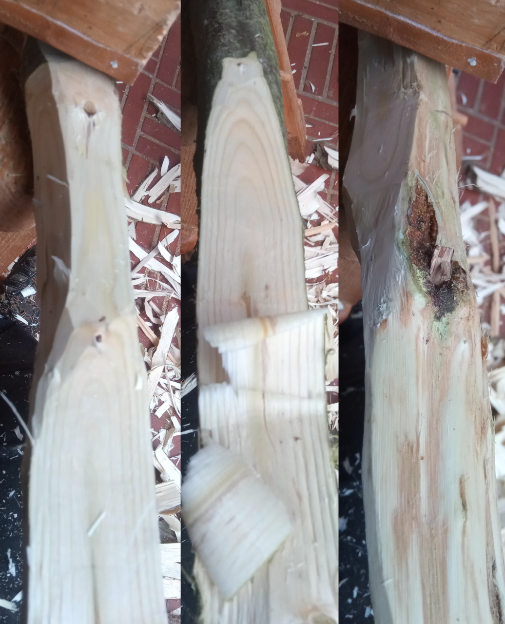 Tja und für das Pfaffenhütchen brauche ich ja noch für den Spalt im Griff etwas mit Kontrast. Dunkles frisches Holz? Wenig Auswahl vor Ort, Kieferkernholz vielleicht, ist aber weich. Wildkirsche? weiß nicht ob es reicht und für ein Stück Griff mache ich ja keinen Sapling um. Ich kannte aber eine Stelle wo ein Robinienstumpf steht, da konnte ich was holen.