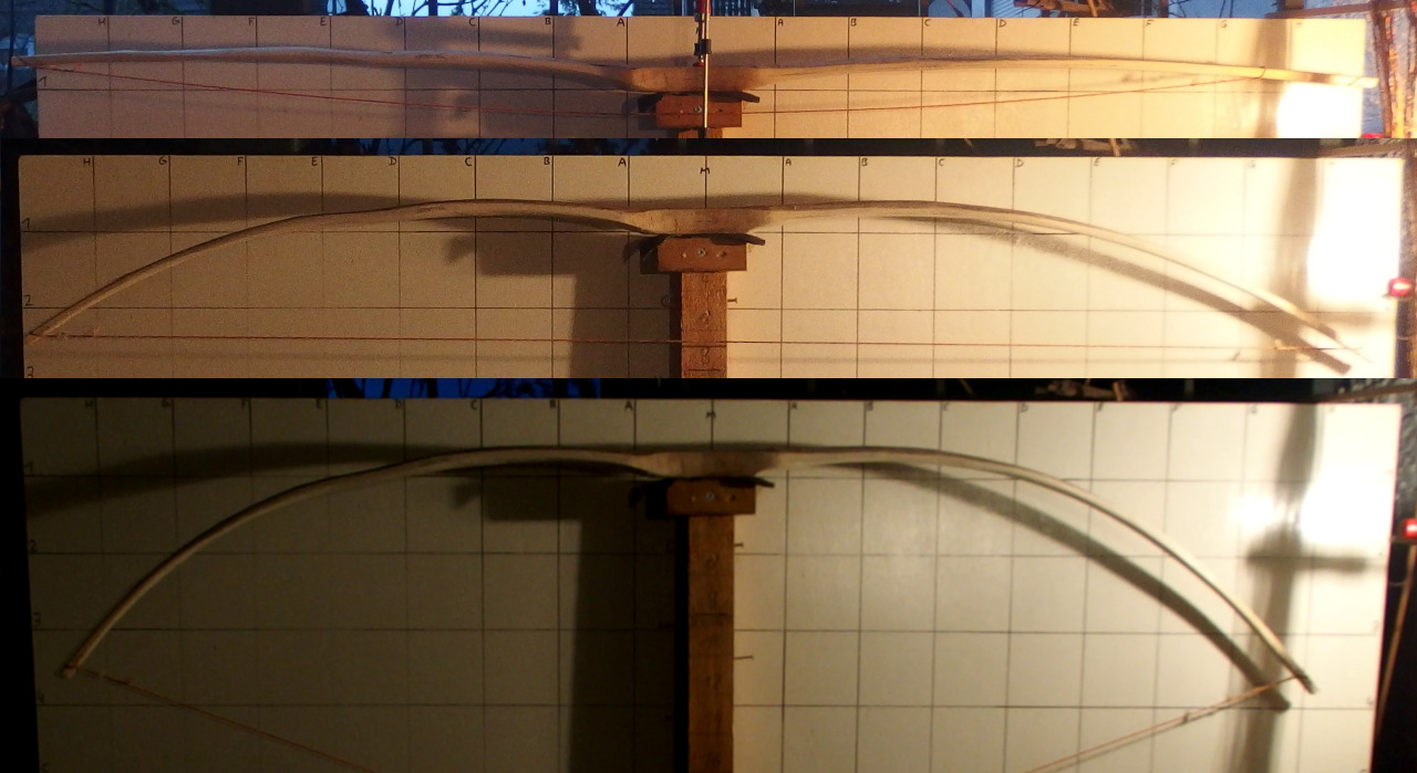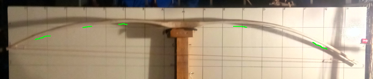 Das war aber nur der Stand am Bogen vorhin, das muss ich mir nochmal in Ruhe überlegen und mit frischerem Kopf. Rechts schien er in der Mitte des Wurfarms weniger zu arbeiten, aber da war ich schon dran. Biegekontrolle mit Brettchen zeigte keine gröberen Probleme, außer vielleicht rechts bei 2/3 der Wurfarmlänge eine stärker biegende Stelle.