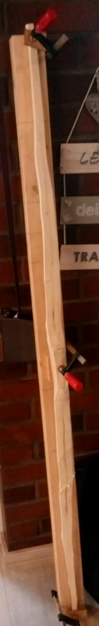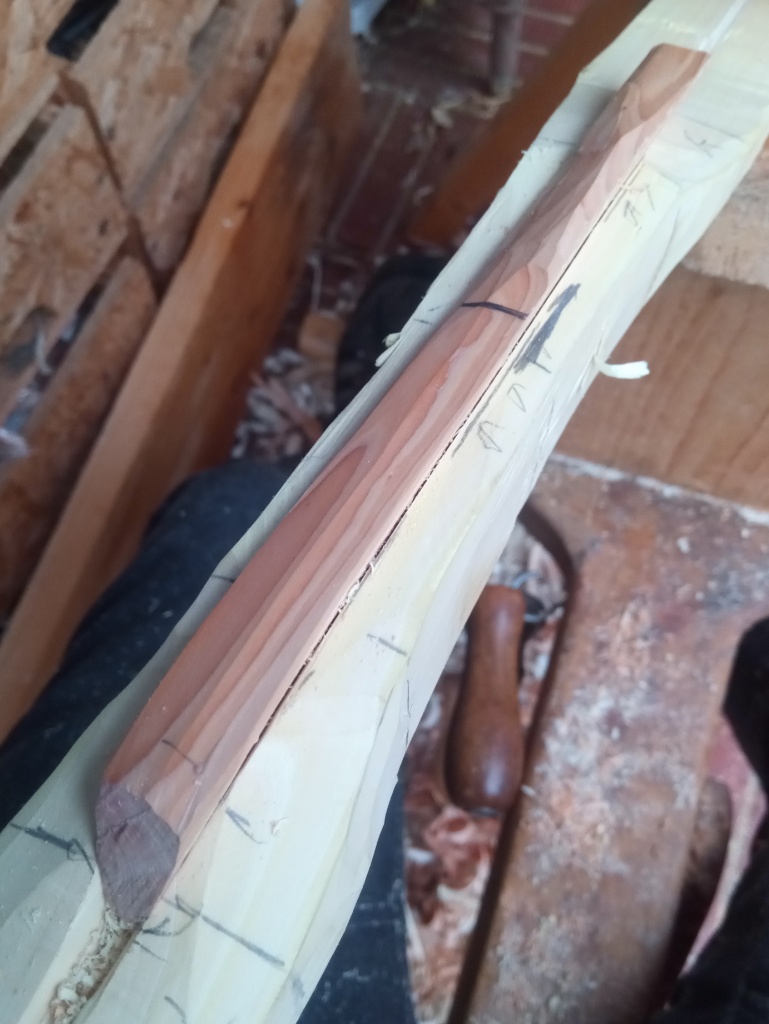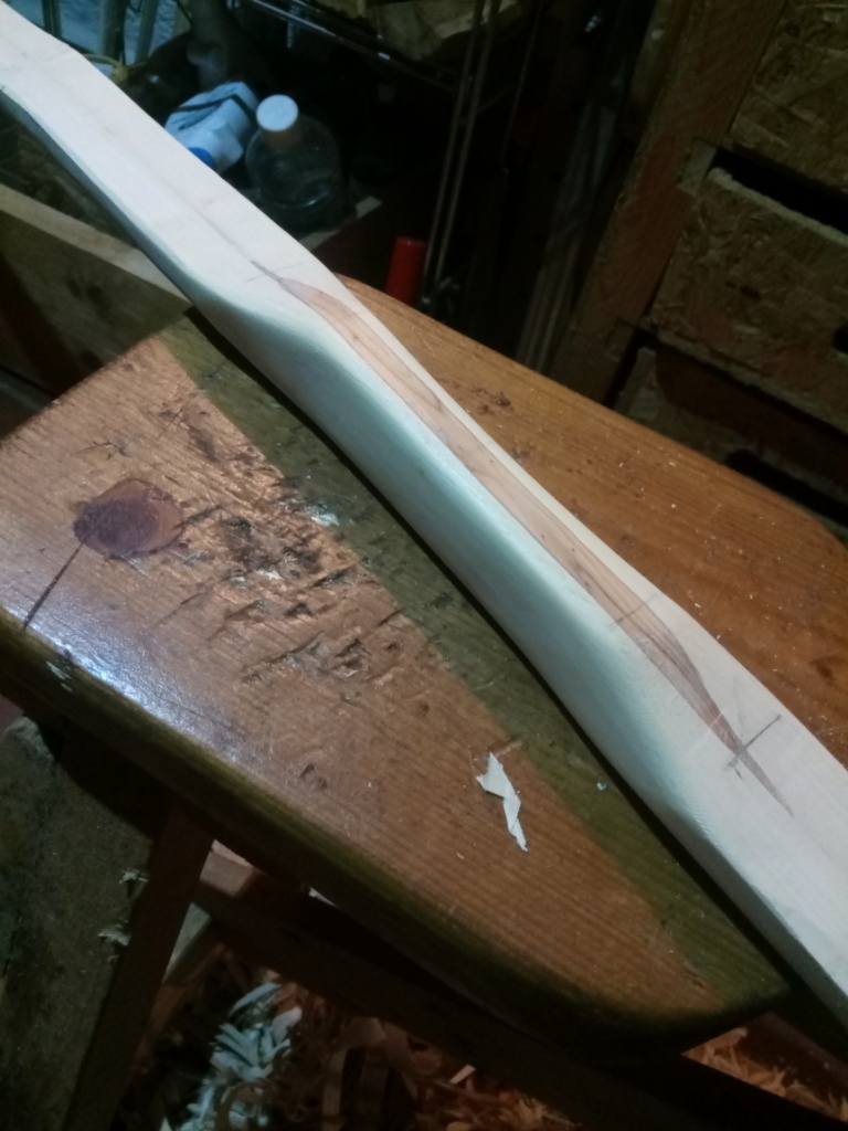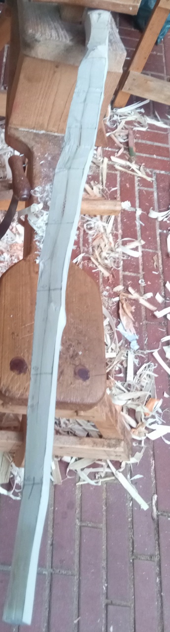 Das Arbeiten mit dem Rohling ist mühsehlig, da durch den Drehwuchs (und vielleicht auch vom Holz selbst) ständig Späne rausreißen bzw. man die Richtung immer kontrollieren muss. Das Holz wirkt eher so, als hätte es weniger Zusammenhalt. Mal gespannt, ob das überhaupt was wird. Ntn eta 175cm, Zuggewicht scheint noch Reserve da zu sein (>40#@28" geschätzt), bei dem Muskelabbau durch lange Bogenschießpause bin ich mir da aber weniger sicher...