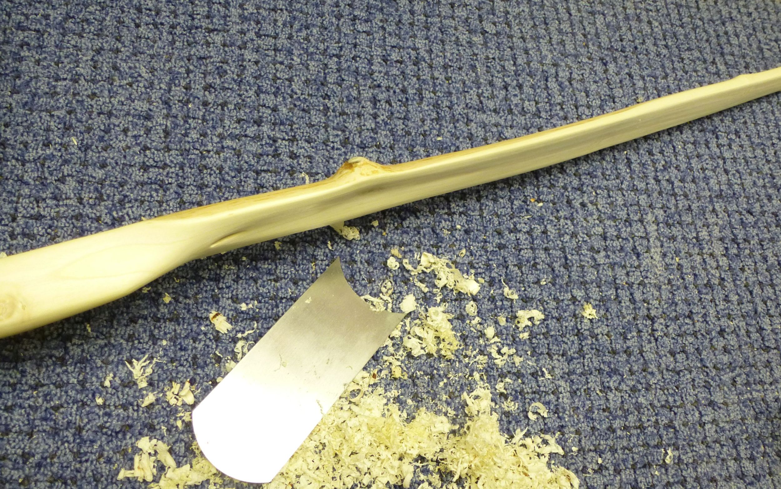 Heute hab ich ein wenig weitergemacht. Esche 1 muss noch weiter trocknen, aber Esche 2 scheint quasi trocken zu sein. Mit Ziehmesser, Ziehklinge und selbst gebasteltem Abstandsmesser hab ich die Wurmarmdicke von Esche 2 so pi mal Daumen in der Dicke Richtung Tip reduziert. Dabei habe ich dass dünne Ende als Maß genommen um nicht unter 30lb zu kommen. Danach hab ich noch die Stiftnocken geschnitzt.