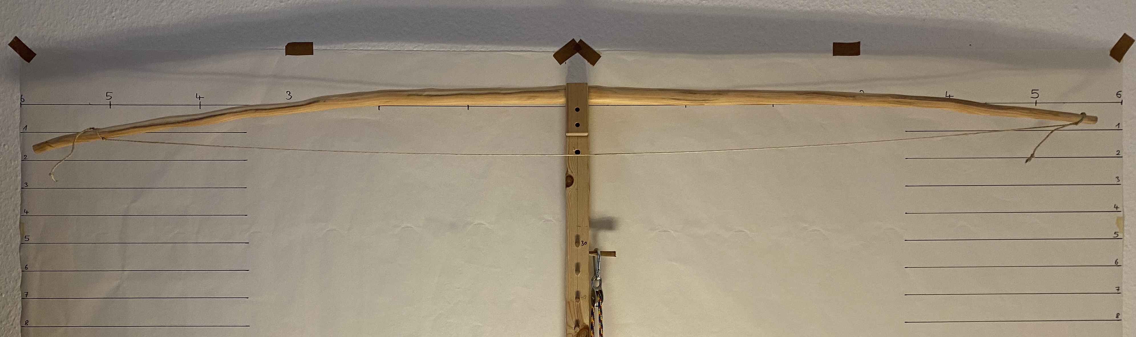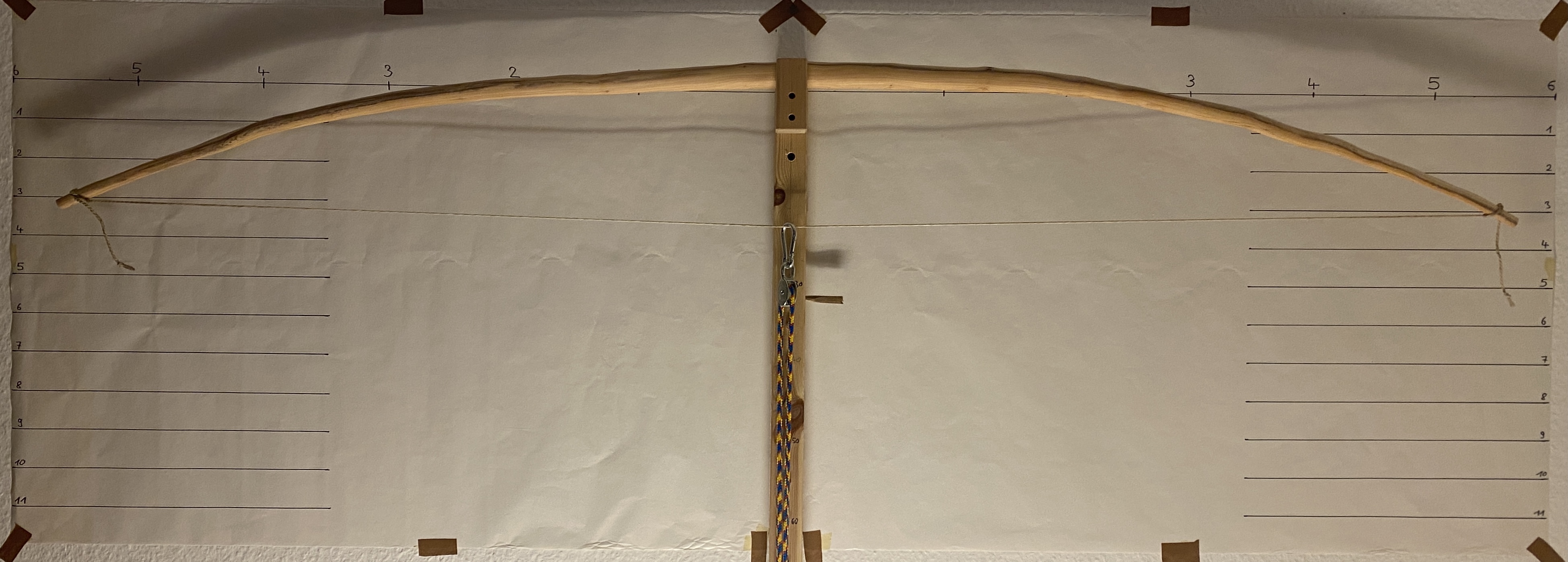 Eben wollte ich nochmal in Standhöhe mit der Tillersehne die korrekte Sehnenlänge feststellen und das Zuggewicht in Vollauszug messen.