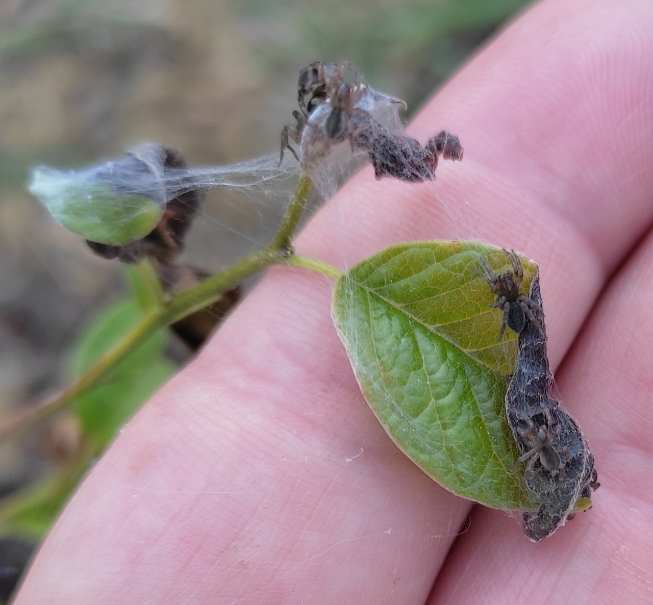 Für mich der ich kein Experte bin, sieht es erst mal so aus, dass die Spinnen das Blatt als Schutz für ihren Nachwuchs einrollen und verspinnen.