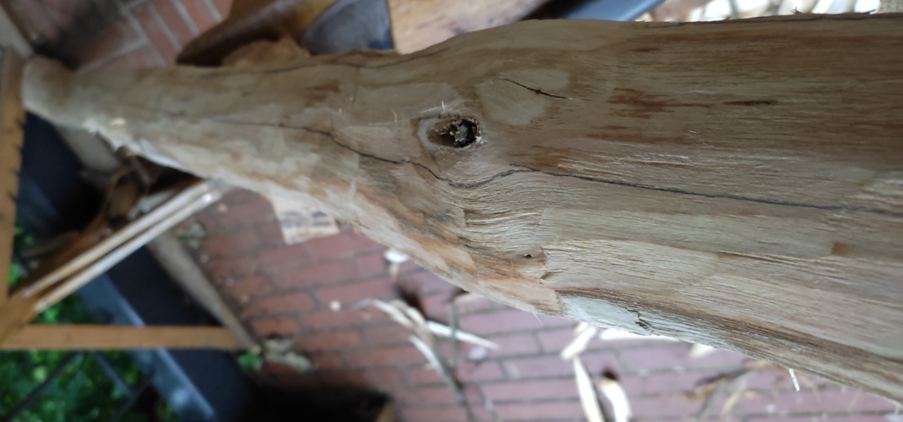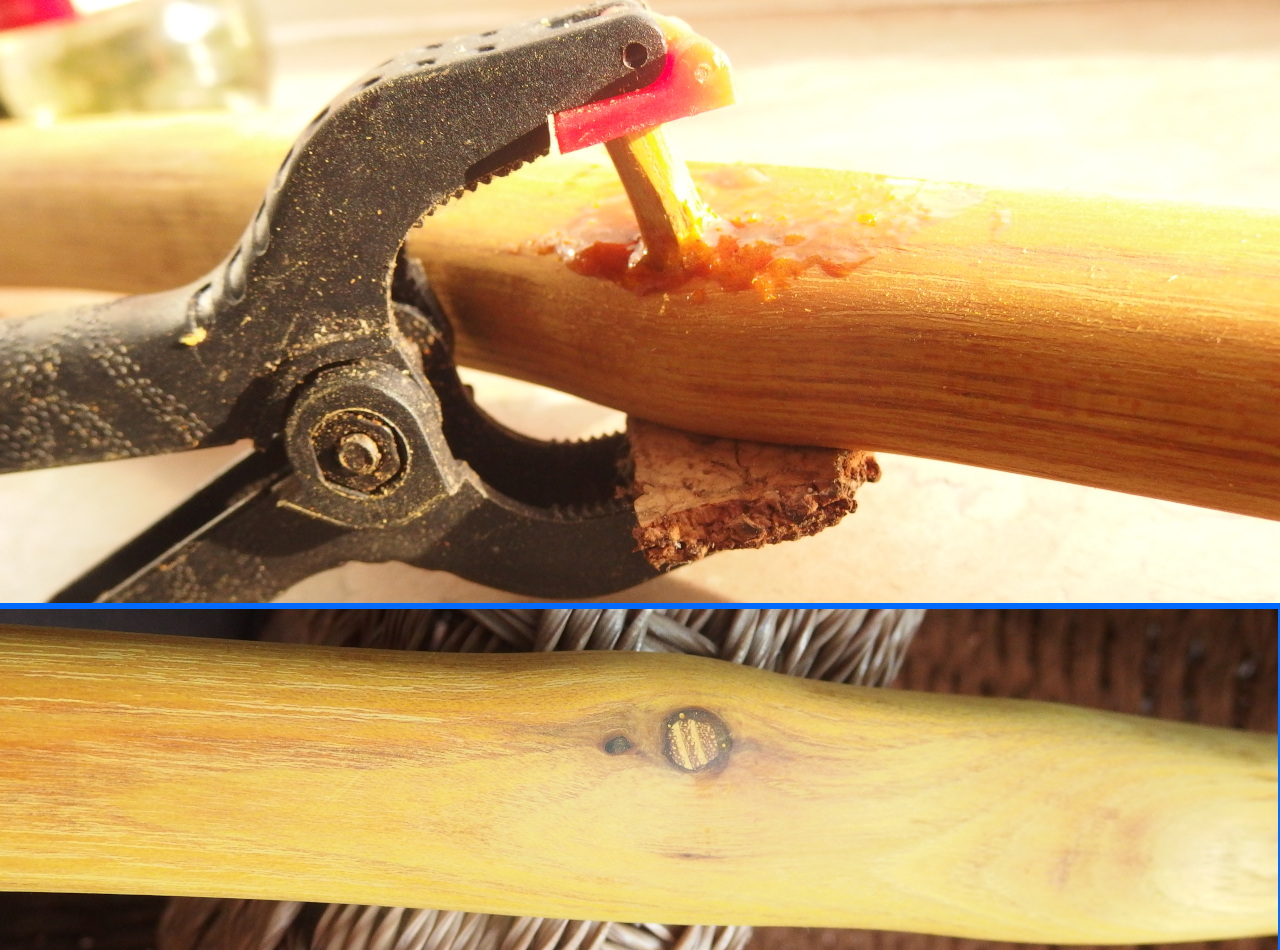 Bei einem Astloch, das nur bauchseitig war, musste ich den Ast rauspopeln und habe ihn durch ein Stück Osage ersetzt, plus rundherum Uhu Endfest mit ein paar Osage-Staubkrümeln.