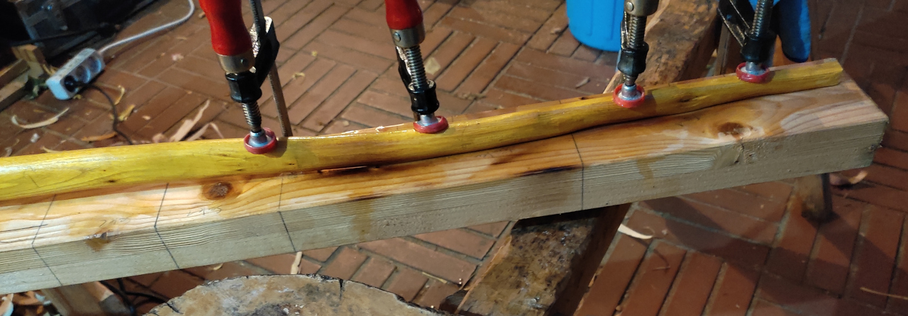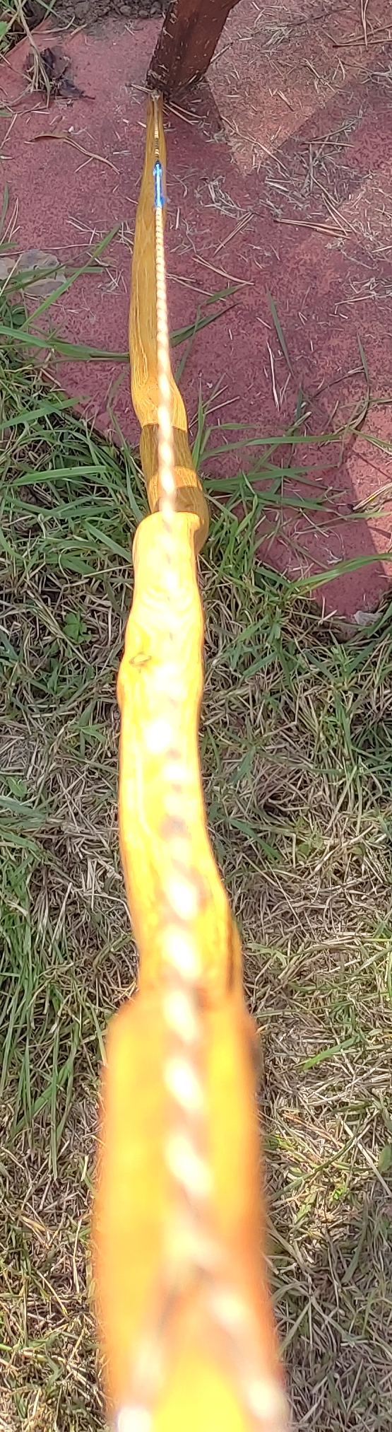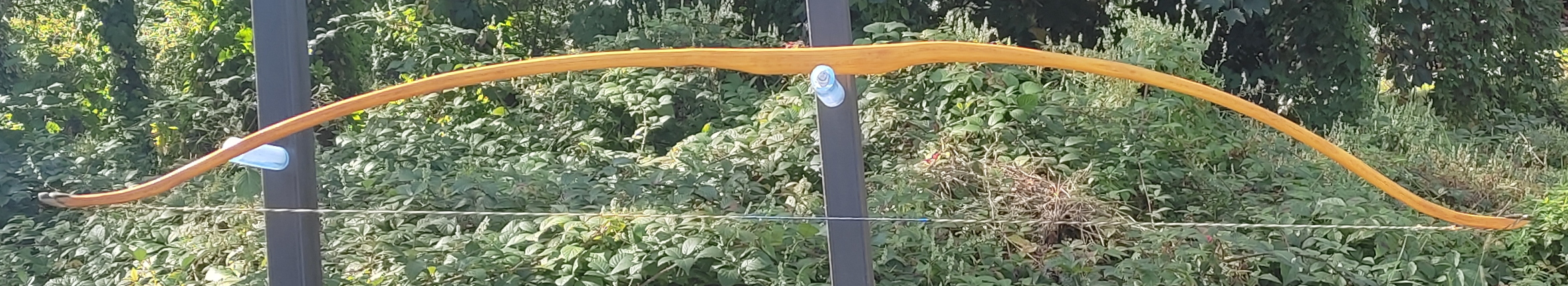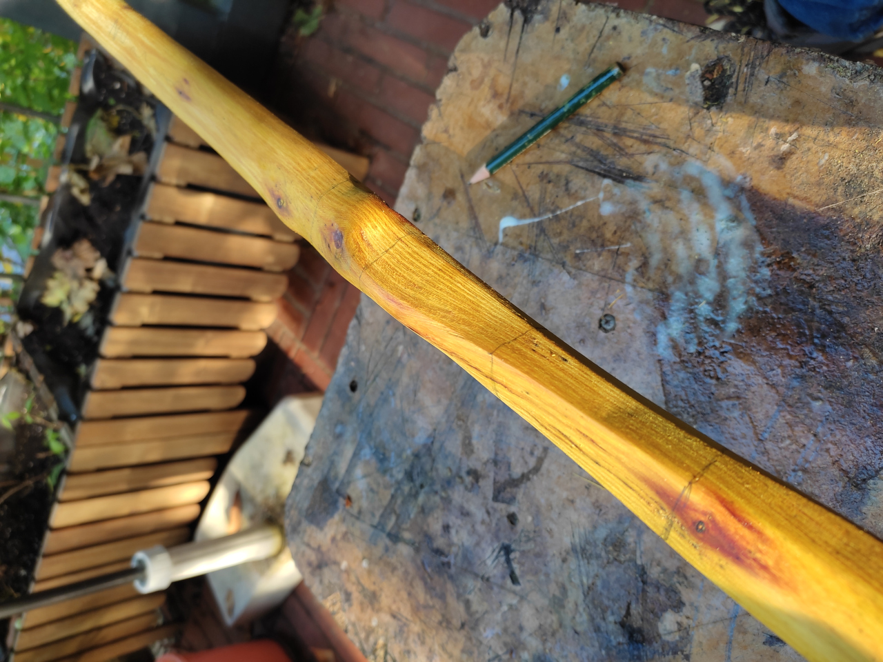 So, in der Zwischenzeit konnte ich etwas weitermachen. Der Recurve unten musste nochmal leicht gedreht werden bzw. der Wurfarm kurz davor. Habe leider keine weiteren Bilder von dem Prozeß gemacht. Dann weiter tillern. Das ist bei diesem Stück etwas knifflig, weil es auf Standhöhe schon ziemlich schief aussieht, als wäre der rechte Wurfarm viel schwächer. Im Vergleich zum abgespannten Zustand paßt es aber und vom Druckgefühl beim Ziehen in der Hand geht es auch. Der Bogen hebt beim Ziehen auf dem Tillerbaum auch nicht ab oder so.