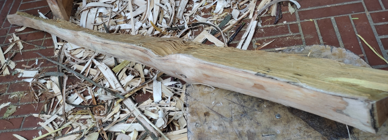 Erstmal der Stave von der Stirnseite her. Der hat im Splint ziemlich mittig einen Riß. Da das Spalten der anderen Staves so prima klappte und die Breite für Osage-Bögen reicht, gehen wir doch mal nicht risikoscheu ans Werk: Von den drei Staves, die ich hatte ergab der erste (kleinere) einen Bogen, der zweite Dicke sogar in Summe drei. Der Stave hier hätte für zwei nebeneinander gereicht. Tja, dummerweise lief das Spalten erstmals nicht wie geplant und es wurde ausgerechnet in der Mitte zu schmal.