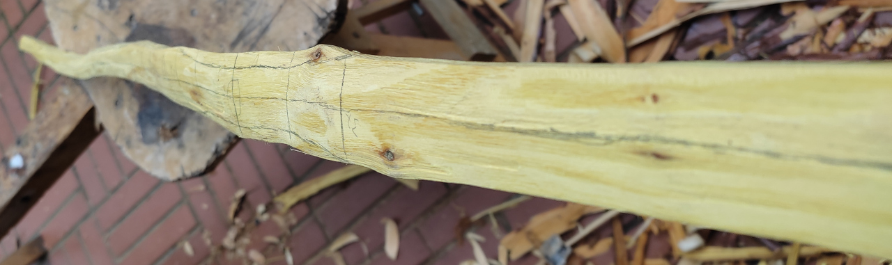 Das schmälere Stück habe ich in etwa halbiert und zwei Billets drauß gemacht: Der andere Teil ist noch üppig: Und weil's in der Dicke noch so viel hat, wieso mit Ziehmesser abmühen, versuche ich doch nochmal spalten im Jahresring: Tja nun, genauer betrachtet ist das kein Abfall, also formen wir etwas: Das Teil hat alle möglichen Wellen (Osage halt) und auch nen dicken Ast, unten noch fest, oben bröselig: Also ausgebohrt das Ding: Mal so Mittenverlauf und Breite aufgezeichnet: Und nachdem das paßt, Jahresring freilegen: Natürlich wäre die Sehne aus der Spur, also biegen: Musste mehrfach sein: Dann noch Recurves dran, diesmal mit engerem Radius als bei den letzten: Drehen musste am Ende auch noch sein...
