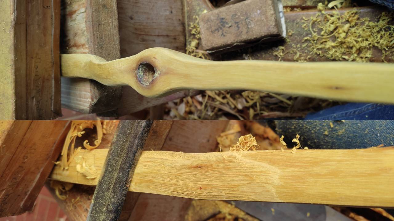Naja und das schwierigste ist der Griff. Da ist nicht viel Holz da, Dicke 24mm nur. Und dann läuft es eher spitz zu. Beim Bodentiller bog der gefühlt nicht so stark mit, aber das merke ich noch. Tja das ist schwierig. Ich habe mir jede Menge Möglichkeiten überlegt, aber keine wirklich gescheite dabei. Entweder kann der Griff so bleiben, jenachdem wie stark er mitbiegt, wird ggf. mit Kork aufgefüttert und Ledergriff. Lieber wäre mir eine Verstärkung. Hölzer gibt's reichlich zur Auswahl, direkt Osage wäre aber was. Nur wie soll man ein Stück Holz an diese verdrehe Form anpassen? Einzelne Streifen nacheinander aufleimen oder kleben? Sieht bestimmt bescheiden aus. Wenn, braucht es wahrscheinlich zwei Stücke, die ausgehend von einem Quader jeweils links und rechts an die Griffbasis angepaßt werden. Stelle ich mir aber sehr aufwendig vor...