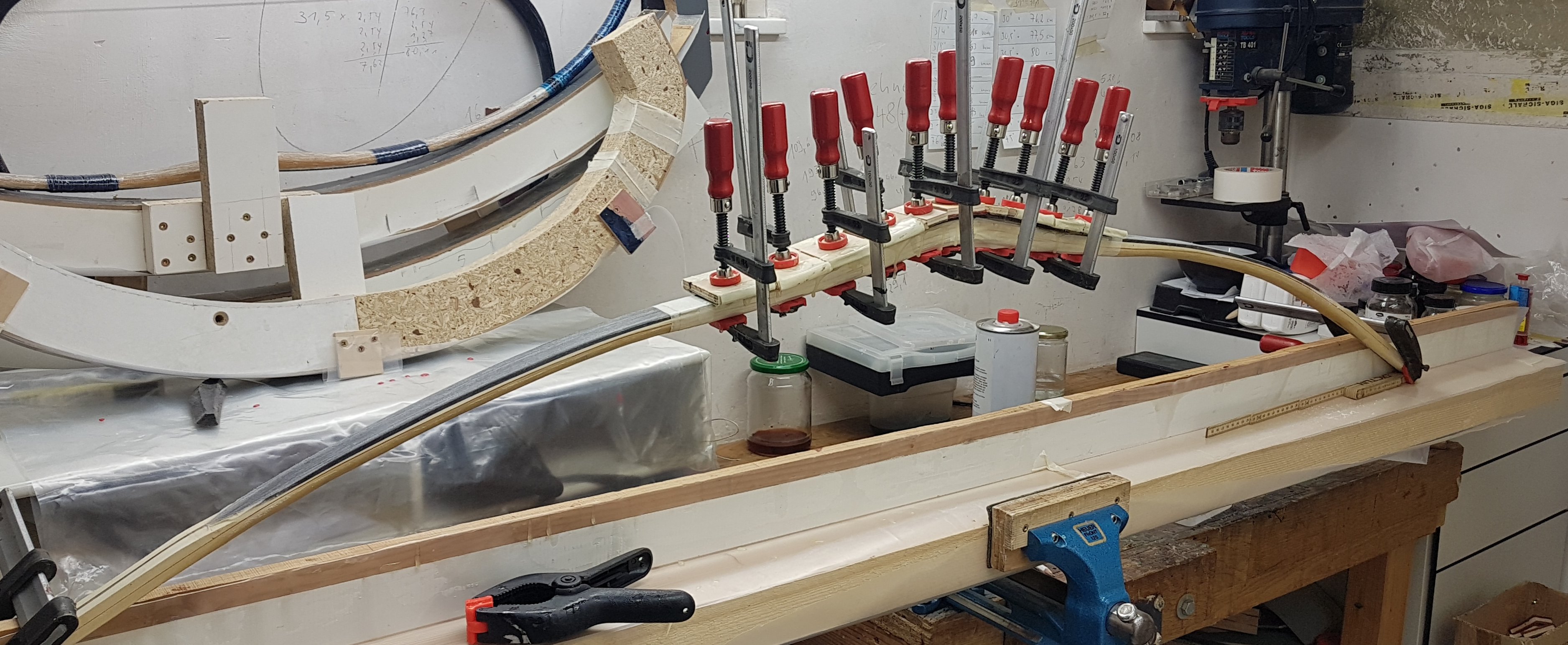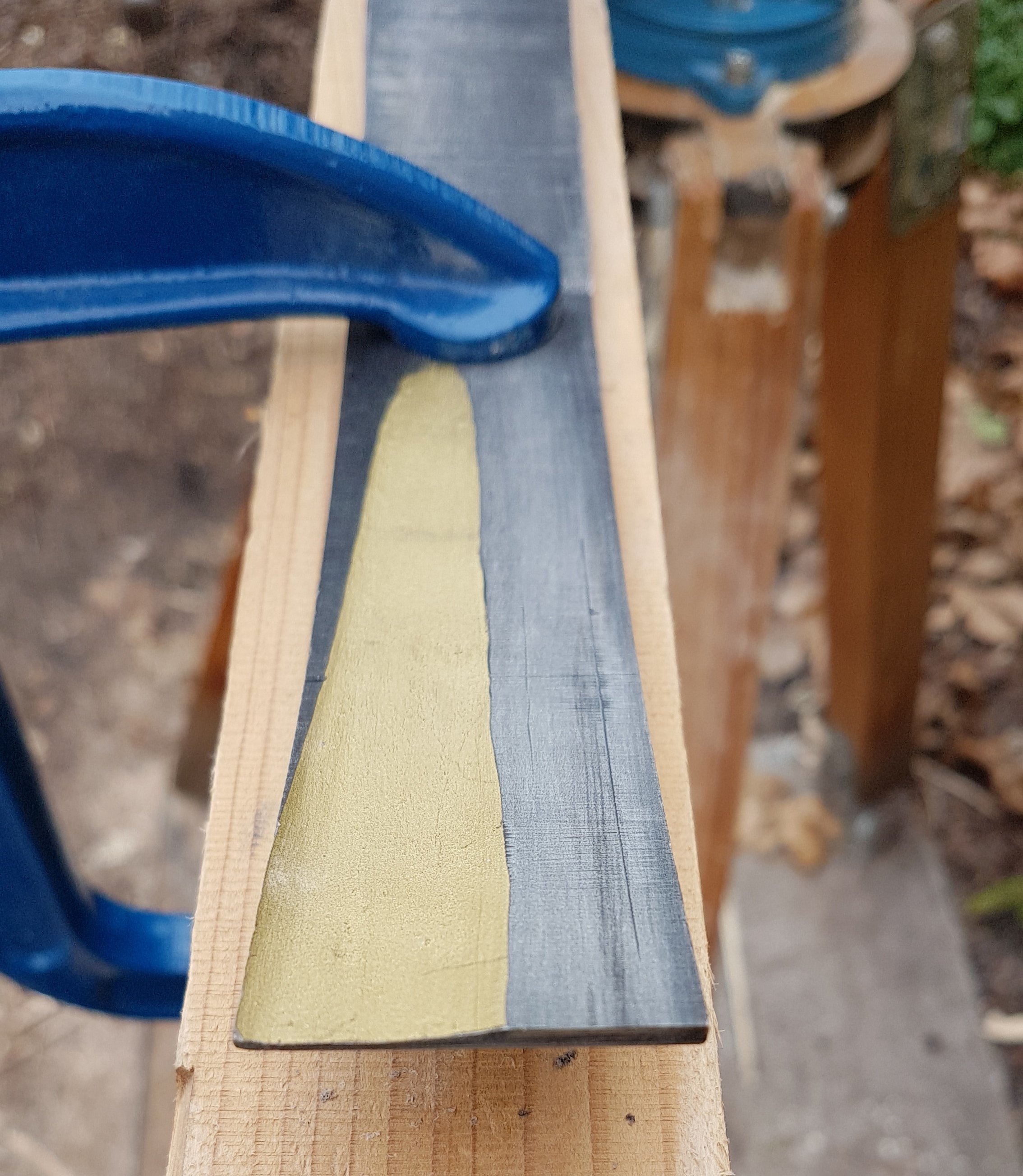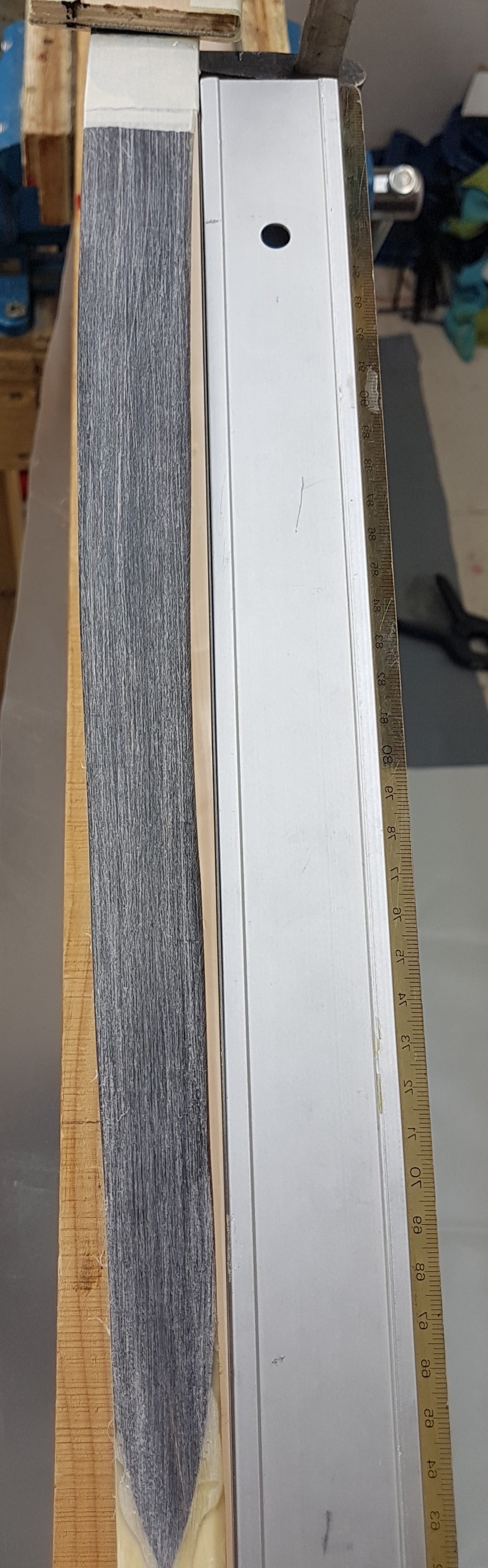 Nach erfolgter Trocknung habe ich heute das zusätzliche Laminat für den Griffbereich nochmal in der Mitte gebogen. Dann geschliffen und aufgeklebt.