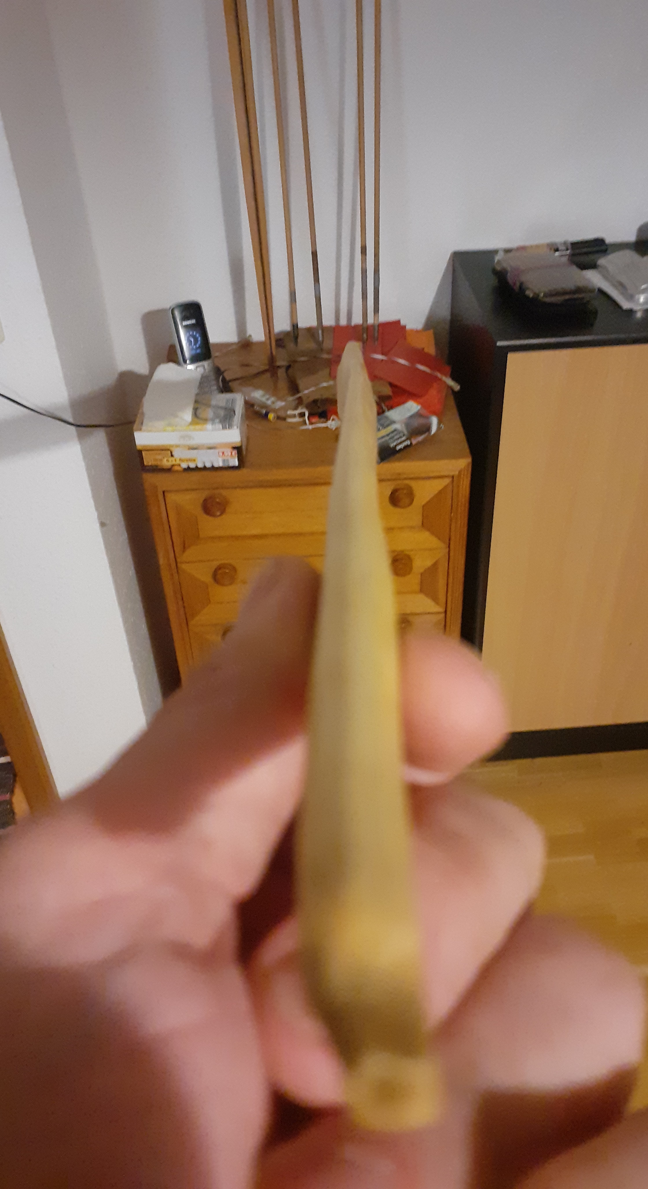 Im Bild das Pfeilset mit je 26g/400gr und links daneben der "Setausleiher",mein alter Hartriegel mit ehemals 52#. Hab sie halt genommen,weil das Gewicht passte.Eigentlich mit 55er Spine nen Tick zu steif,das macht aber nix,der Griff ist schmal genug.Die grauen Tapes an der Spitze der Pfeile sind die 27"-Auszugsmarke.