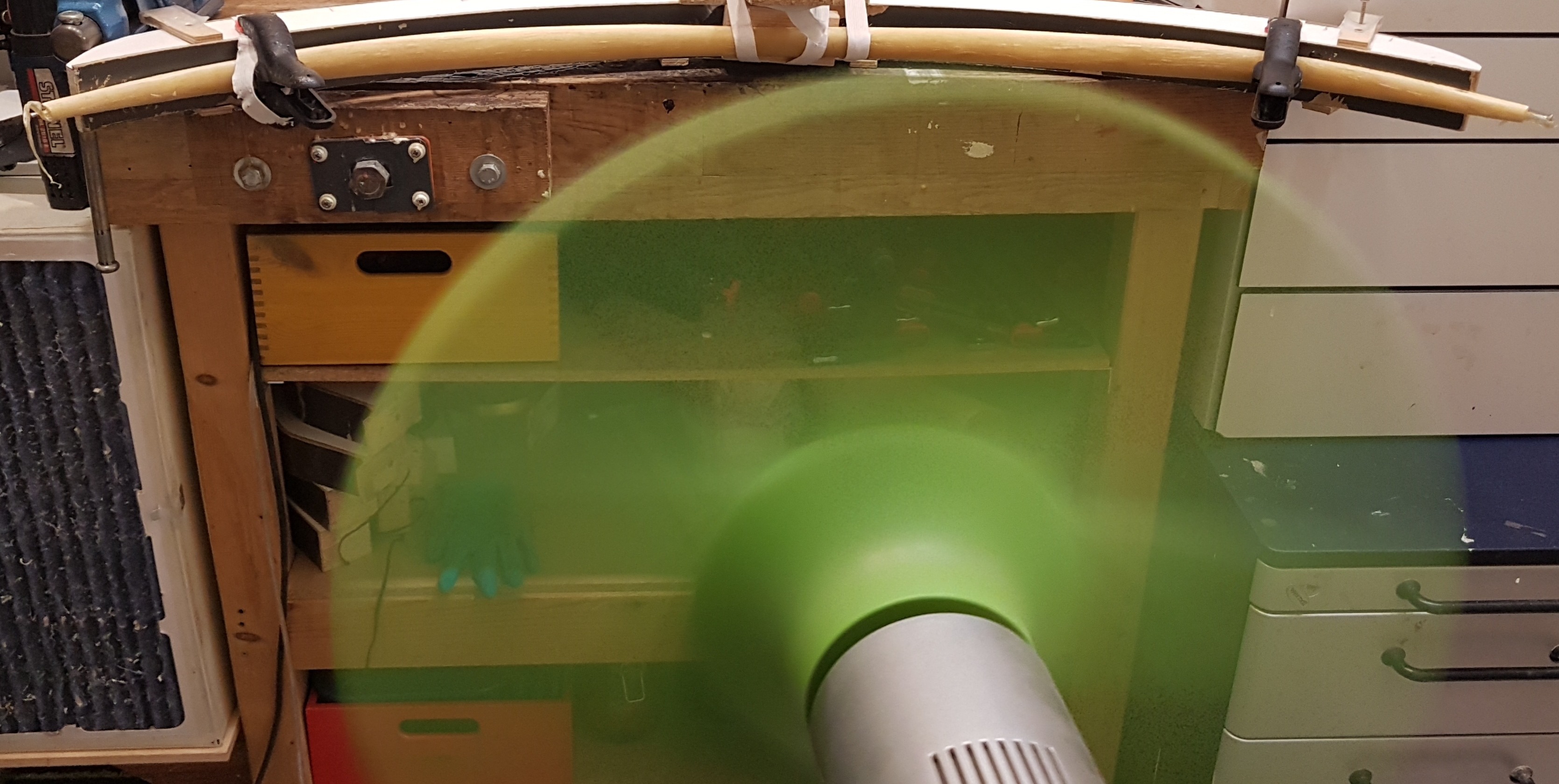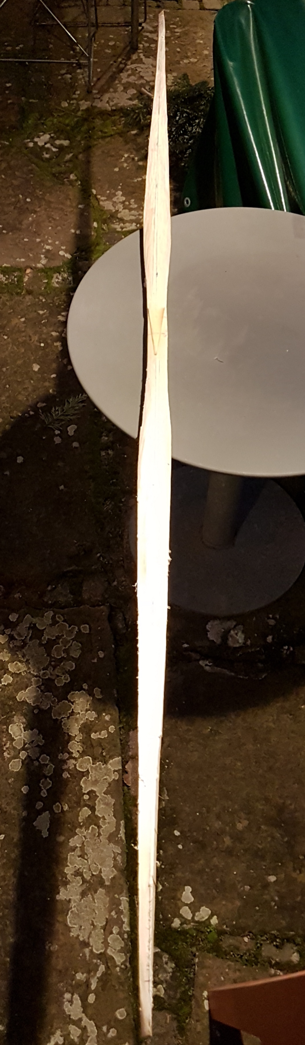 Bogen 02 lang: mittlerweile wurde die Seitenlinie fertig ausgearbeitet. Da der Mittenbereich in einem kurzen Stück zu dünn war, habe ich eine Aufdopplung aufgeklebt. Praktischerweise hatte ich noch die zweite, deflexe Hälfte vom kurzen Bogen übrig - zwar noch nicht 100% trocken aber ausreichend um ein Stück abrichten zu können und zu kleben.