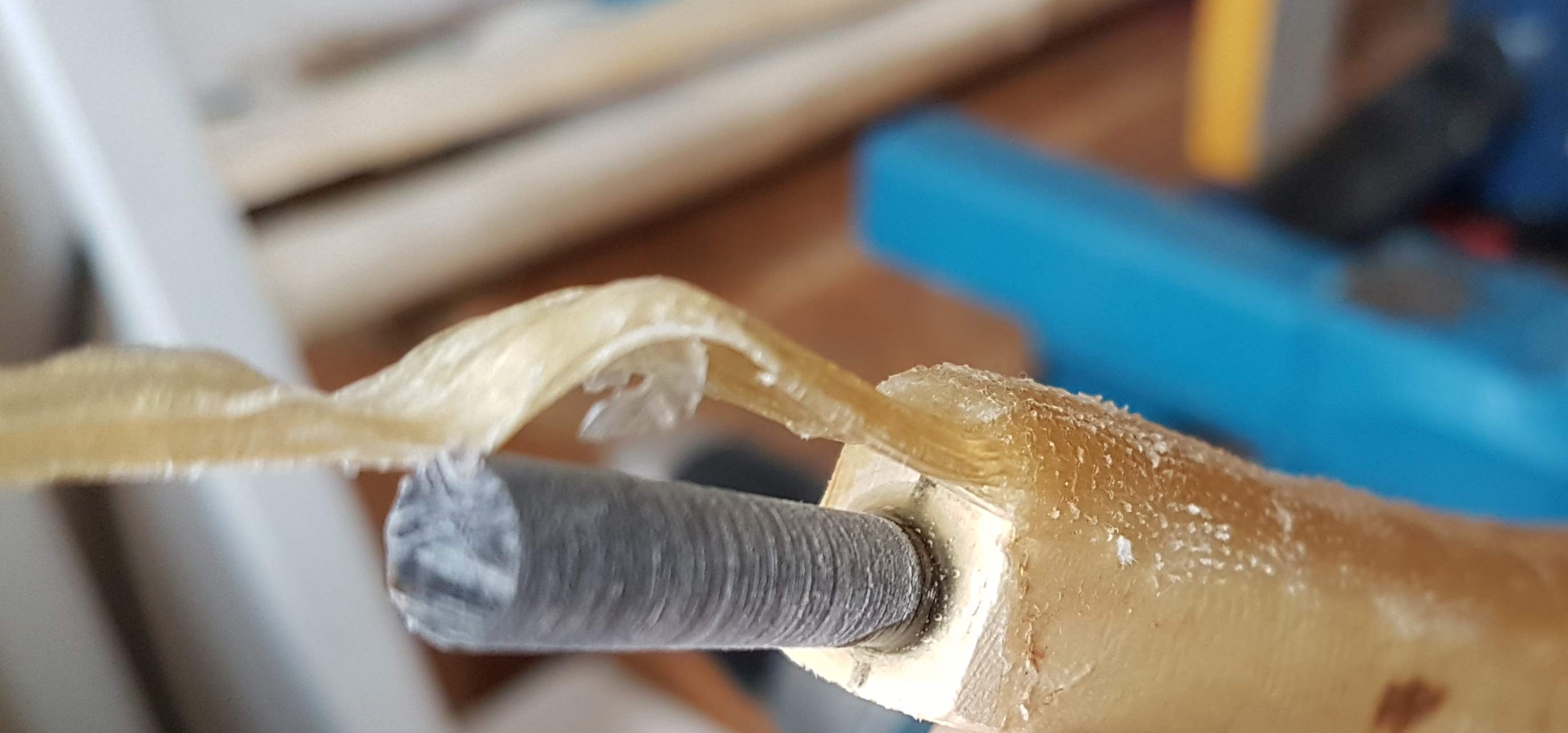 Bogen 01 kurz bekam heute noch eine Lage Sehnen im Griffbereich, für sowas sind die kurzen Rothirschsehnen genau das richtige.